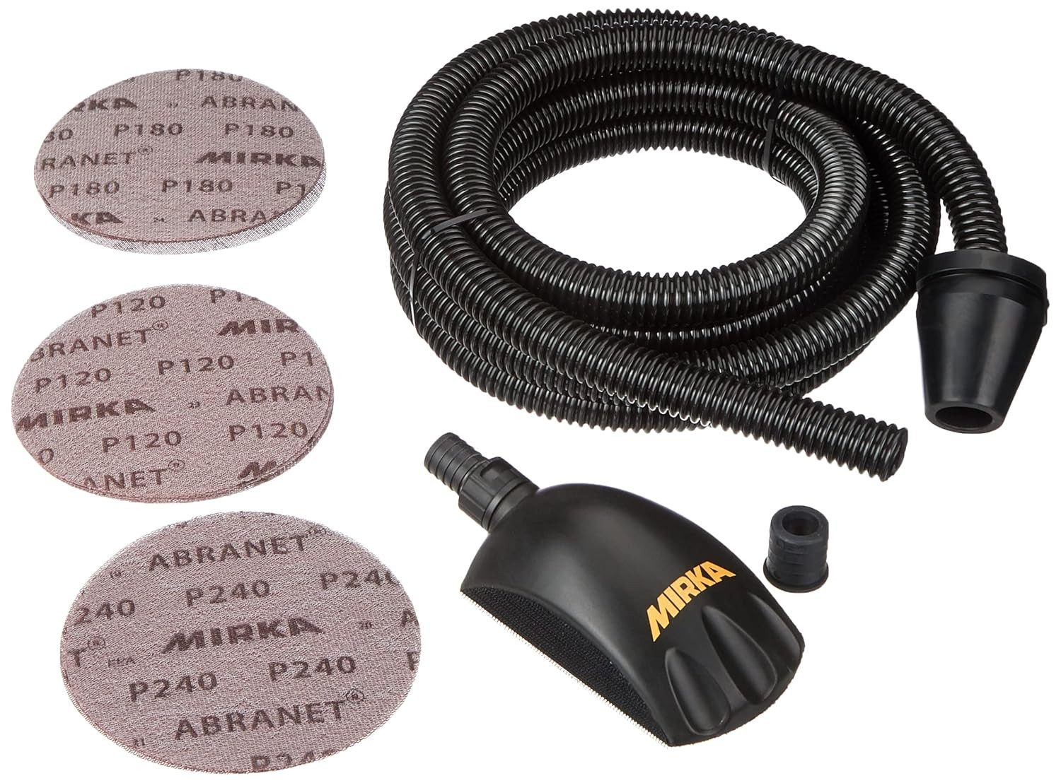 Lieferumfang: 1 x Mirka Roundy Schleifblock, 1 x Absaugschlauch für Handblöcke 4m x Ø 20 mm, Abranet Gitternetz-Schleifscheiben Ø 150mm Korn: 5 x P120, 5 x P180, 5 x P240