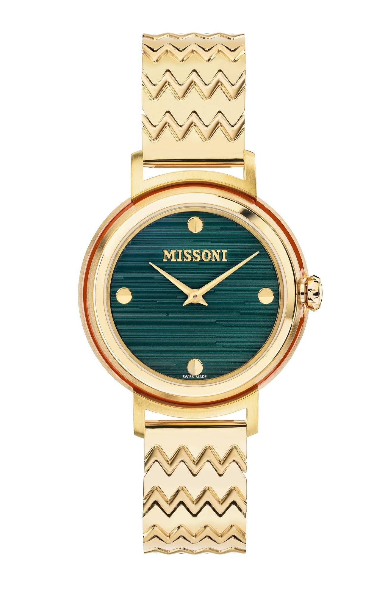 Die Missoni Fiammato Damenuhr arbeitet mit dem Quarzwerk Ronda VE762E/3. Das Gehäuse und das Armband sind aus goldfarbenem Edelstahl gefertigt. Das Zifferblatt ist in der Farbe grün welches mit Fiammato verziert ist, einem speziellen Effekt aus unscharfen Streifen, der ein typisches und einzigartiges Merkmal der Missoni-Strickwaren ist. Das Zifferblatt ist durch ein entspiegeltes Saphirglas vor Beschädigungen geschützt. Die Uhr ist eine elegante Ergänzung für legere und formelle Anlässe.