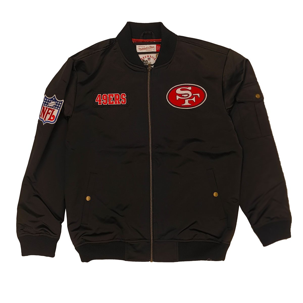 Die Mitchell & Ness Herren Jacke San Francisco 49ers Team Leader Satin Bomber in Schwarz ist ein unverzichtbares Kleidungsstück für jeden echten 49ers-Fan. Diese stilvolle Jacke verfügt über hochwertige Stickereien auf der linken und rechten Brust, die das ikonische Teamlogo und weitere Designelemente präsentieren. Eine zusätzliche Stickerei am rechten Ärmel setzt einen besonderen Akzent und verleiht der Jacke einen einzigartigen Look. Die praktische Tasche am linken Ärmel bietet Platz für kleine Essentials und erhöht den Tragekomfort. Gefertigt aus luxuriösem Satinmaterial, kombiniert diese Bomberjacke modernen Stil mit erstklassigem Tragegefühl. Zeigen Sie Ihre Unterstützung für die San Francisco 49ers und setzen Sie ein modisches Statement mit diesem exklusiven Stück von Mitchell & Ness.