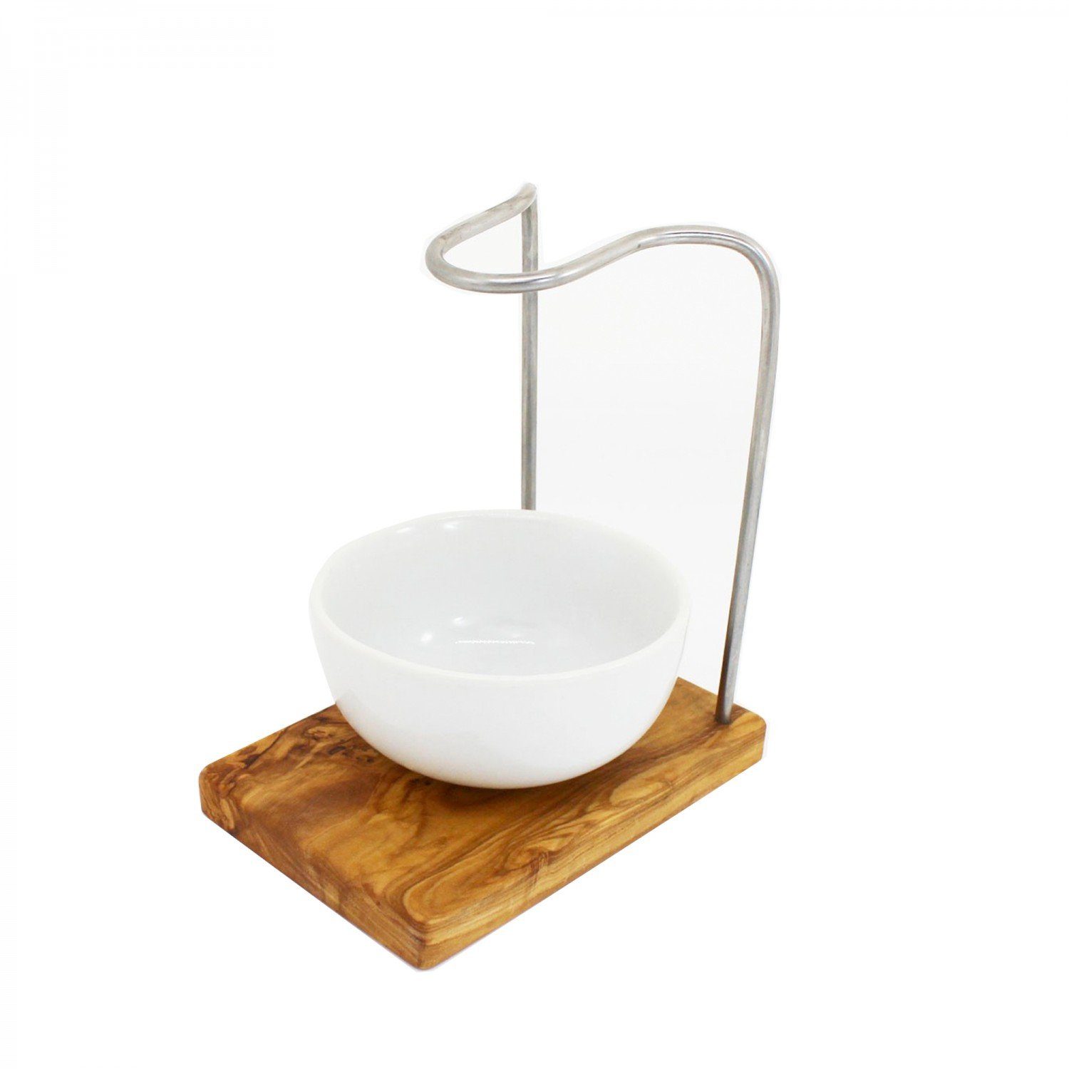 Dieser moderne und schlichte Halter für den Rasierpinsel besteht aus einem Metallständer in einem Sockel aus Olivenholz. Dazu gehört die Porzellanschale, um die Nässe aufzufangen. Das Olivenholz ist besonders langlebig und leicht zu säubern. Einfach mit einem freuchten Tuch abwischen und ab und an etwas einölen. So wirst Du ewig Freude an dem Produkt haben.