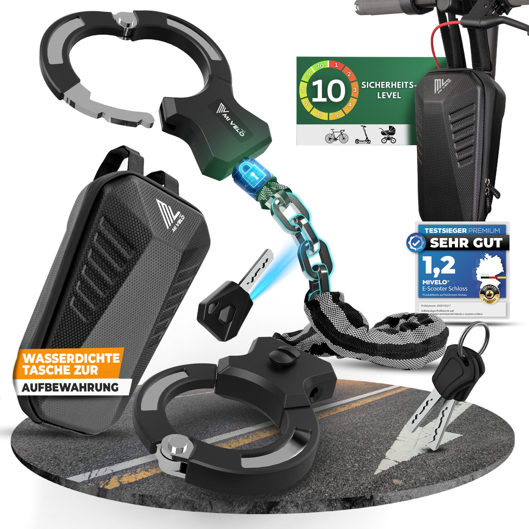 Das perfekte Schloss für E-Scooter, Fahrrad, E-Bike & E-Roller – mit Schlüssel, Tasche und extra starker Kette. Kompakt, sicher und alltagstauglich!