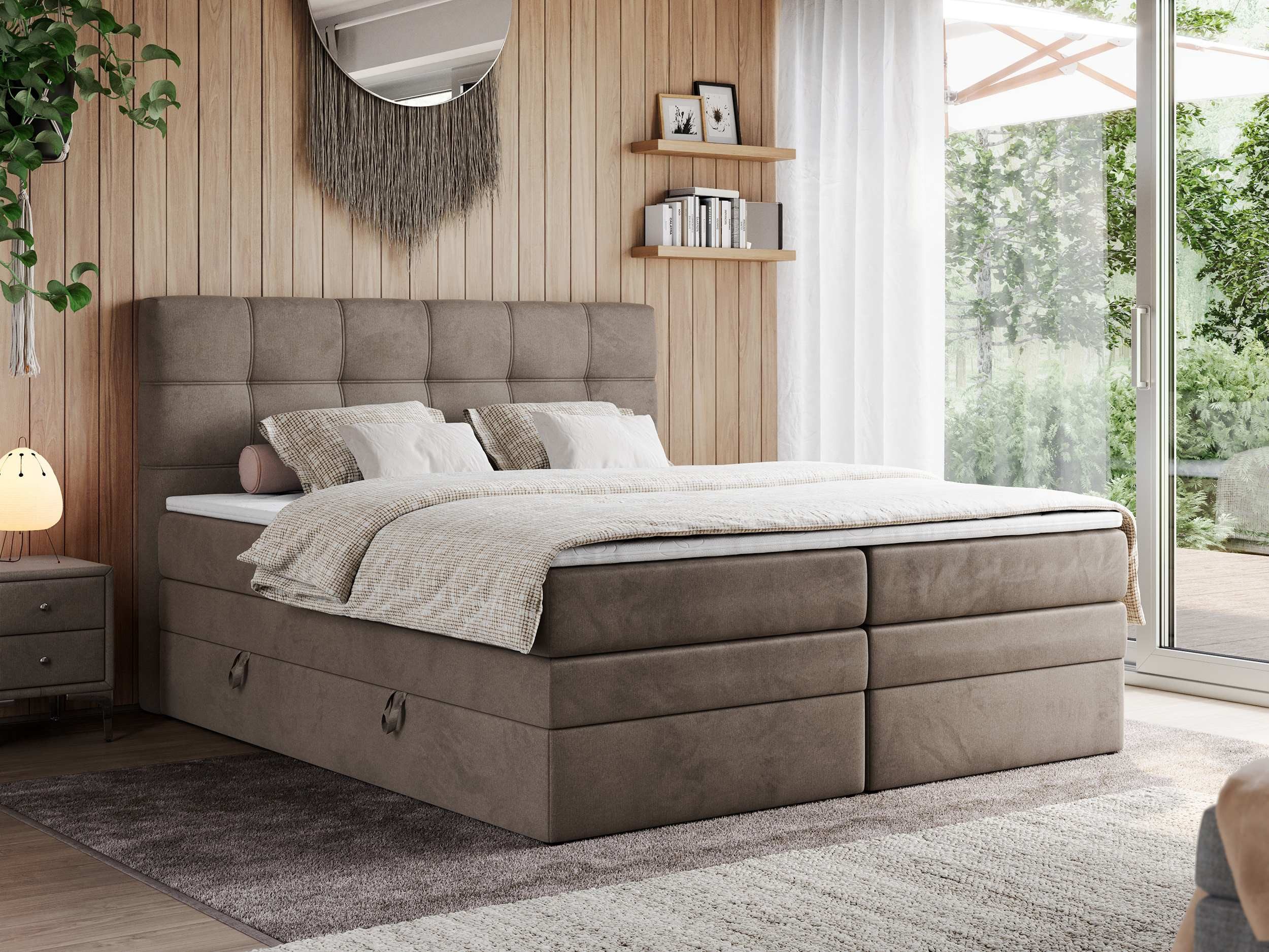 Das Boxspringbett mit mehreren Aufbewahrungsmöglichkeiten ist aus stabilen und extrem langlebigen Materialien gefertigt und wird standardmäßig mit einem doppelten Aufbewahrungskasten und einer PREMIUM Matratzen geliefert.