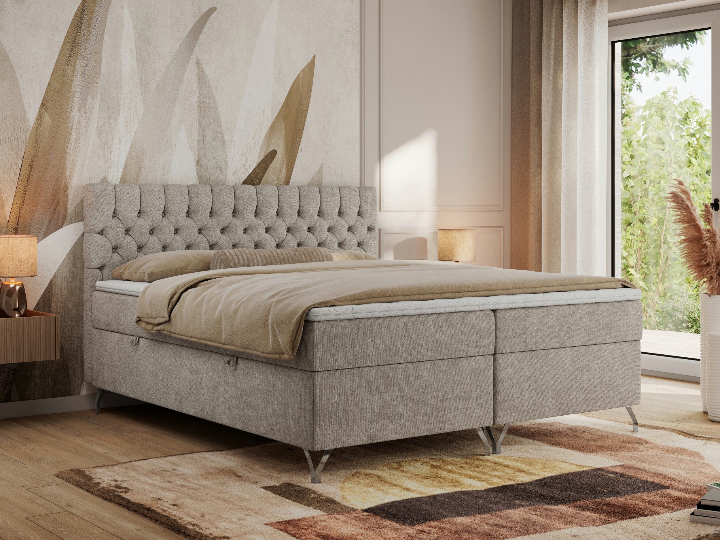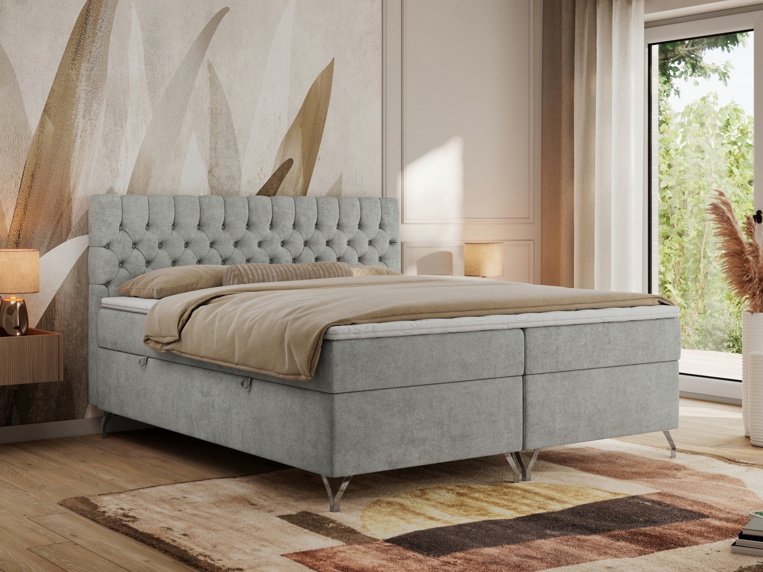 Das zentrale Element, das Bett mit Stauraum, ist ein tief gestepptes Kopfteil mit eleganter Verarbeitung, das nicht nur einen Hauch von Luxus verleiht, sondern auch bequemen Halt beim Lesen. Die solide Konstruktion aus Holz und Möbelplatten sorgt für Stabilität und Langlebigkeit. Hohe, dekorative, silberne Beine verleihen dem Doppelbett mit Kopfteil außergewöhnliche Leichtigkeit und fügen sich harmonisch in jeden Raumstil ein.