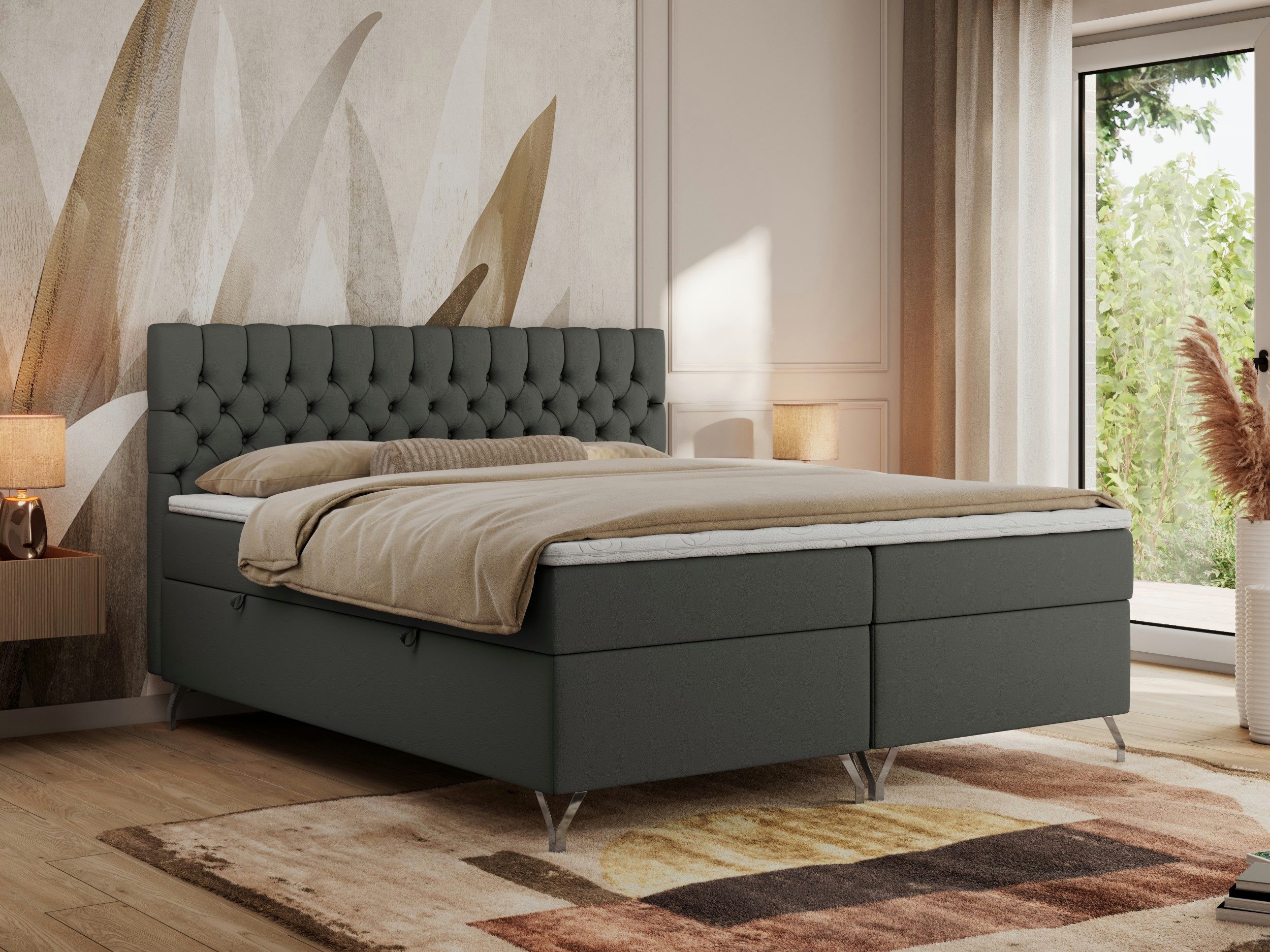 Das Polsterbett mit Matratze ist mit zwei Bettkästen ausgestattet, die sich dank des integrierten Federmechanismus leicht öffnen lassen. Sie bieten viel Platz zum Aufbewahren von Bettwäsche und sorgen für Ordnung im Schlafzimmer.