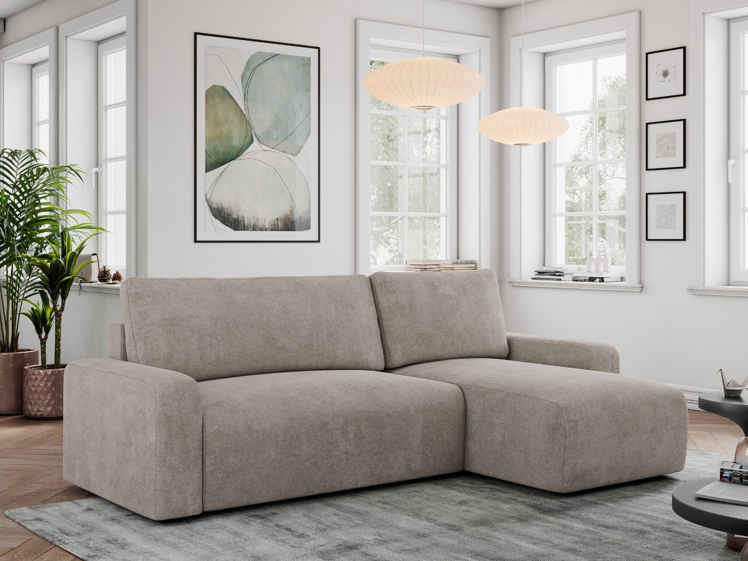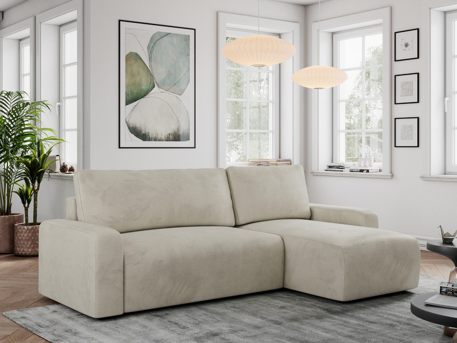 Die hochwertige Konstruktion aus einer Kombination von massivem Holz und robusten Möbelplatten garantiert Stabilität und Langlebigkeit. Für optimalen Komfort ist das Schlafsofa mit Wellenfedern und hochwertigem Polyurethanschaum gepolstert. Das glatte Sitzpolster und die harmonisch gestalteten Rückenkissen schaffen ein modernes und stilvolles Erscheinungsbild, das sich ideal in jeden Einrichtungsstil einfügt – von skandinavischem bis zeitgenössischem.