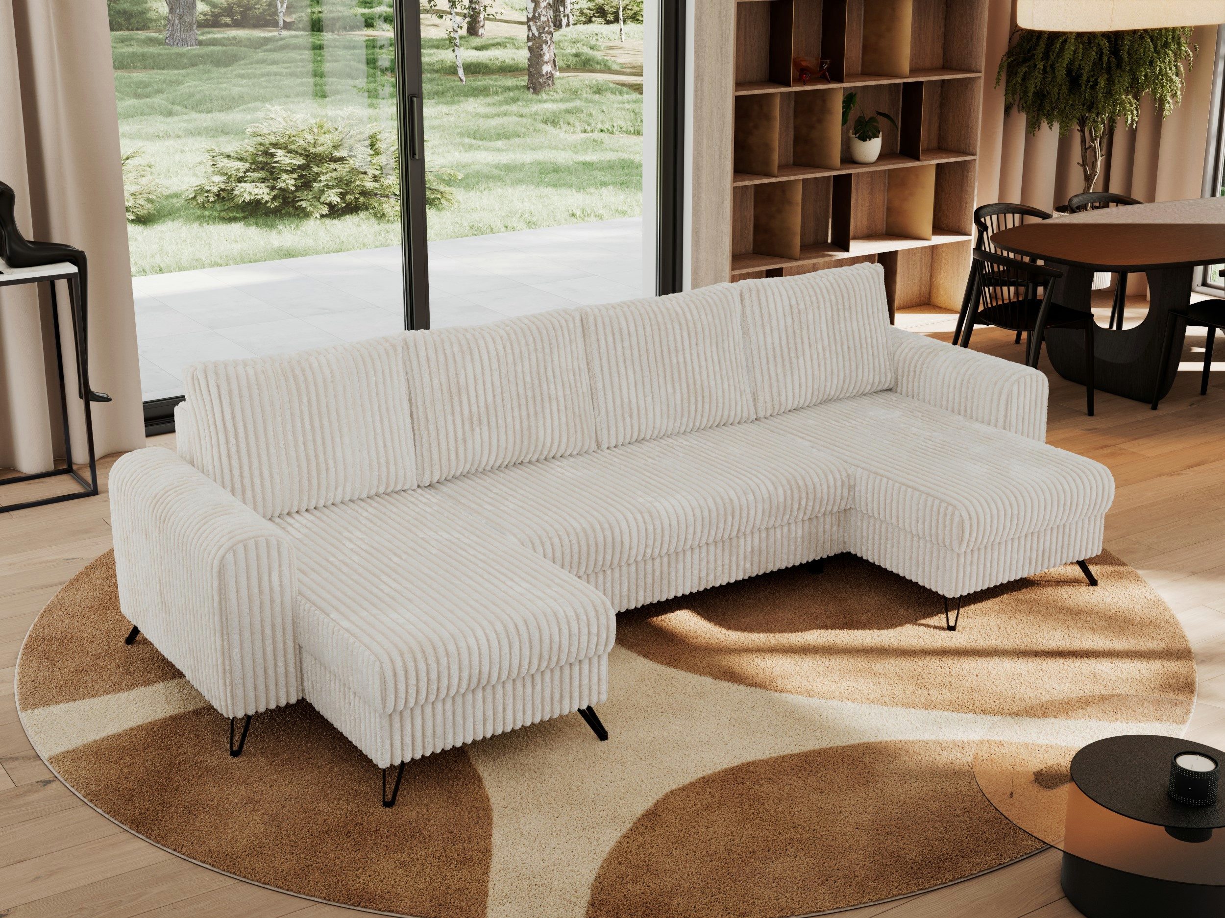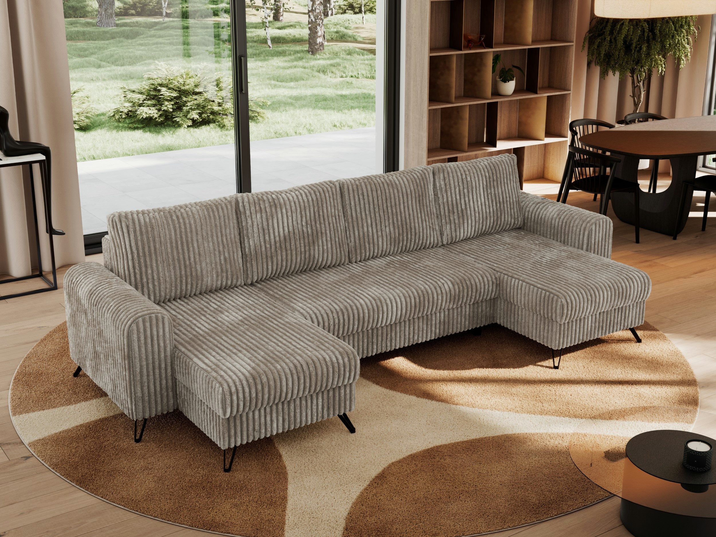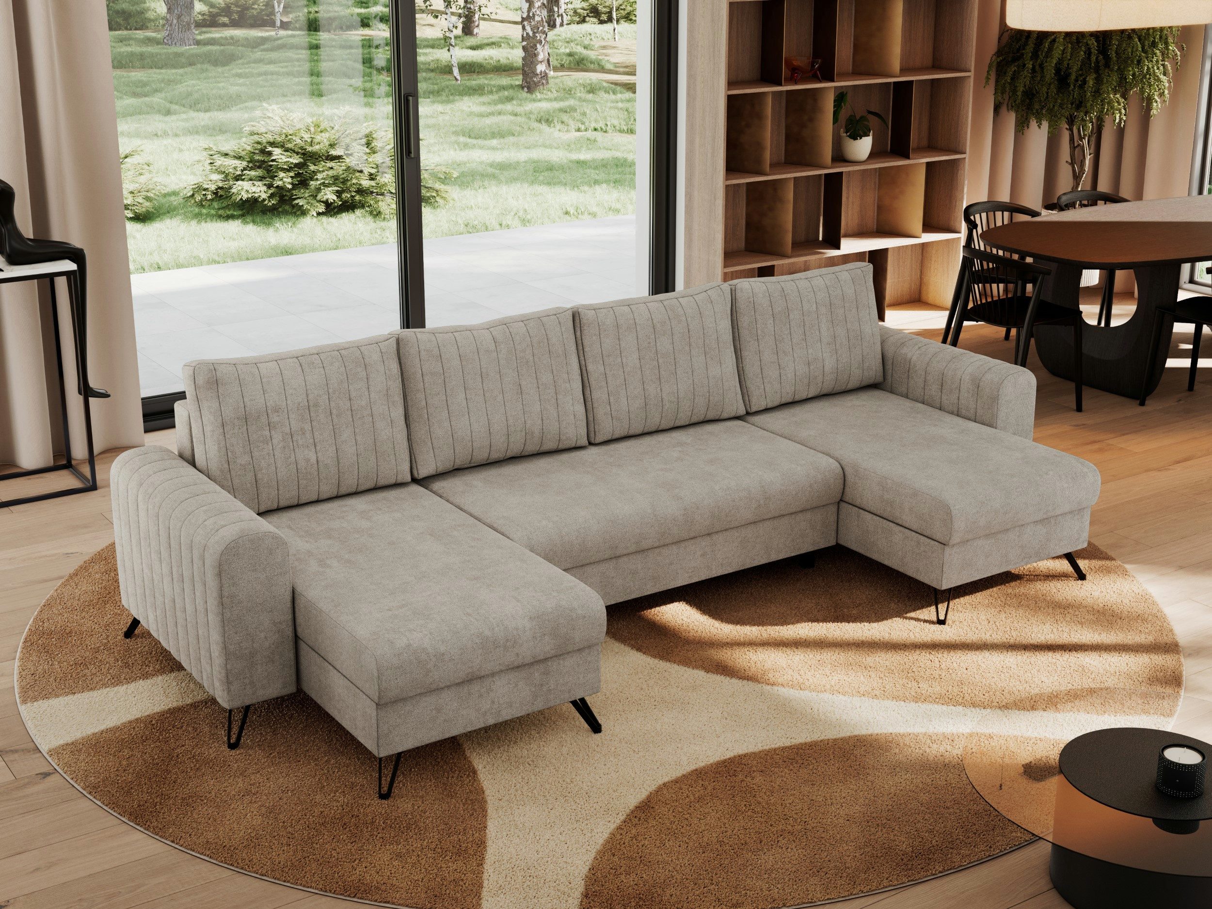 Die Sitzfläche ist mit hochwertigem T30-Schaum und Bonell-Federkern ausgestattet, was für eine optimale Balance zwischen Weichheit und Stützkraft sorgt. Das sorgt nicht nur für langanhaltenden Komfort, sondern auch für eine hohe Langlebigkeit der Polsterung. Die weichen Rückenkissen bieten zusätzlichen Komfort und machen das Schlafsofa zu einem idealen Ort der Entspannung. Das Das Besondere an der Wohnlandschaft U-form ist die vertikalen Ziernähte auf den Kissen und Armlehnen, die der U-förmigen Ecke eine stilvolle, moderne Optik verleihen. Charakteristisch für die Couch sind außerdem die abgerundeten Armlehnen.