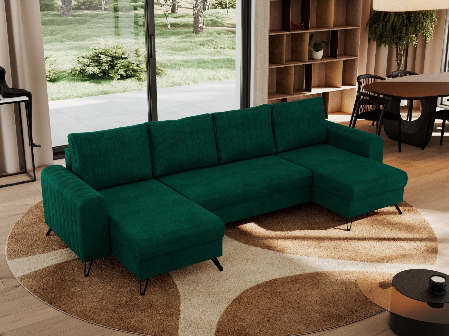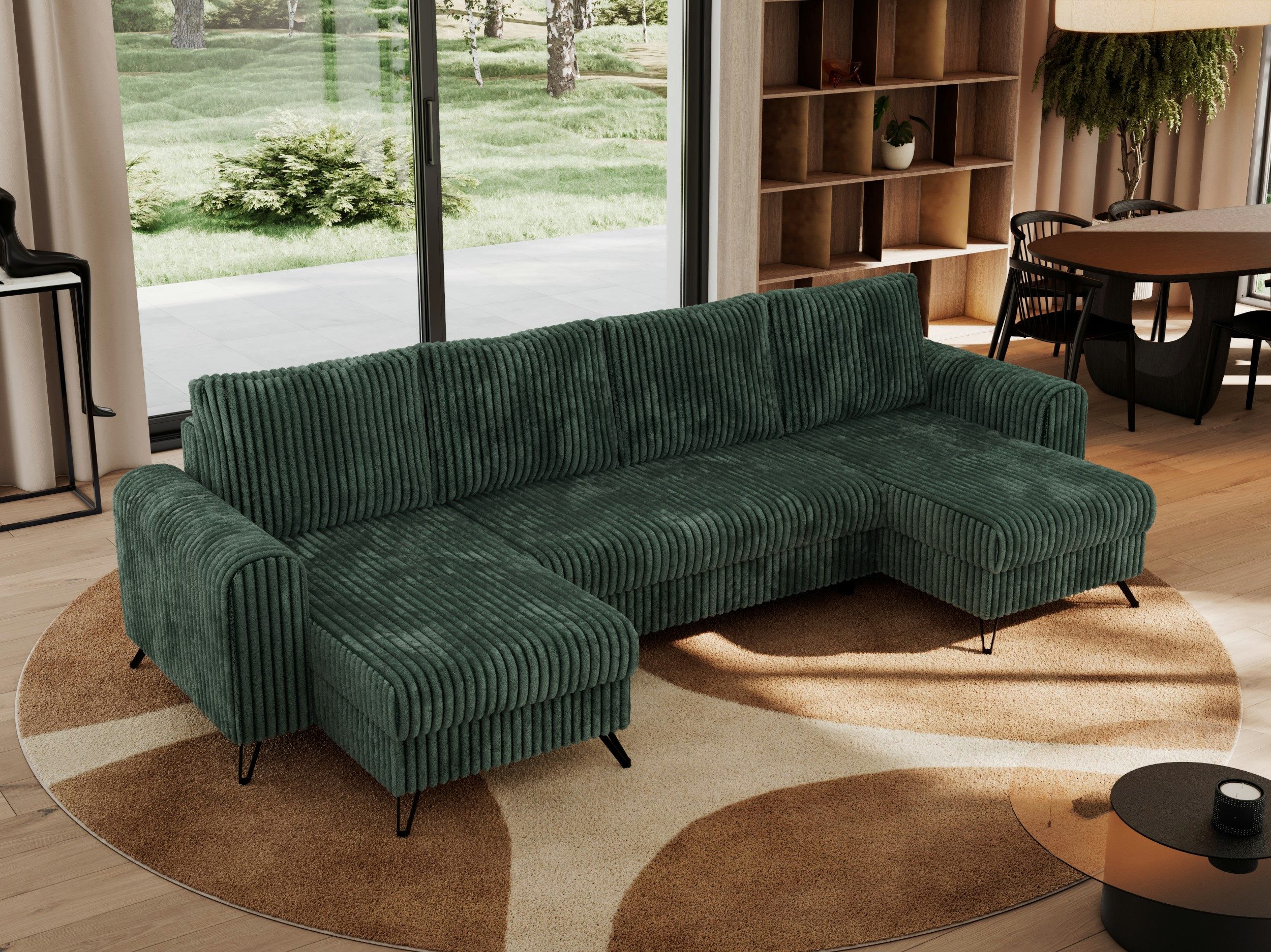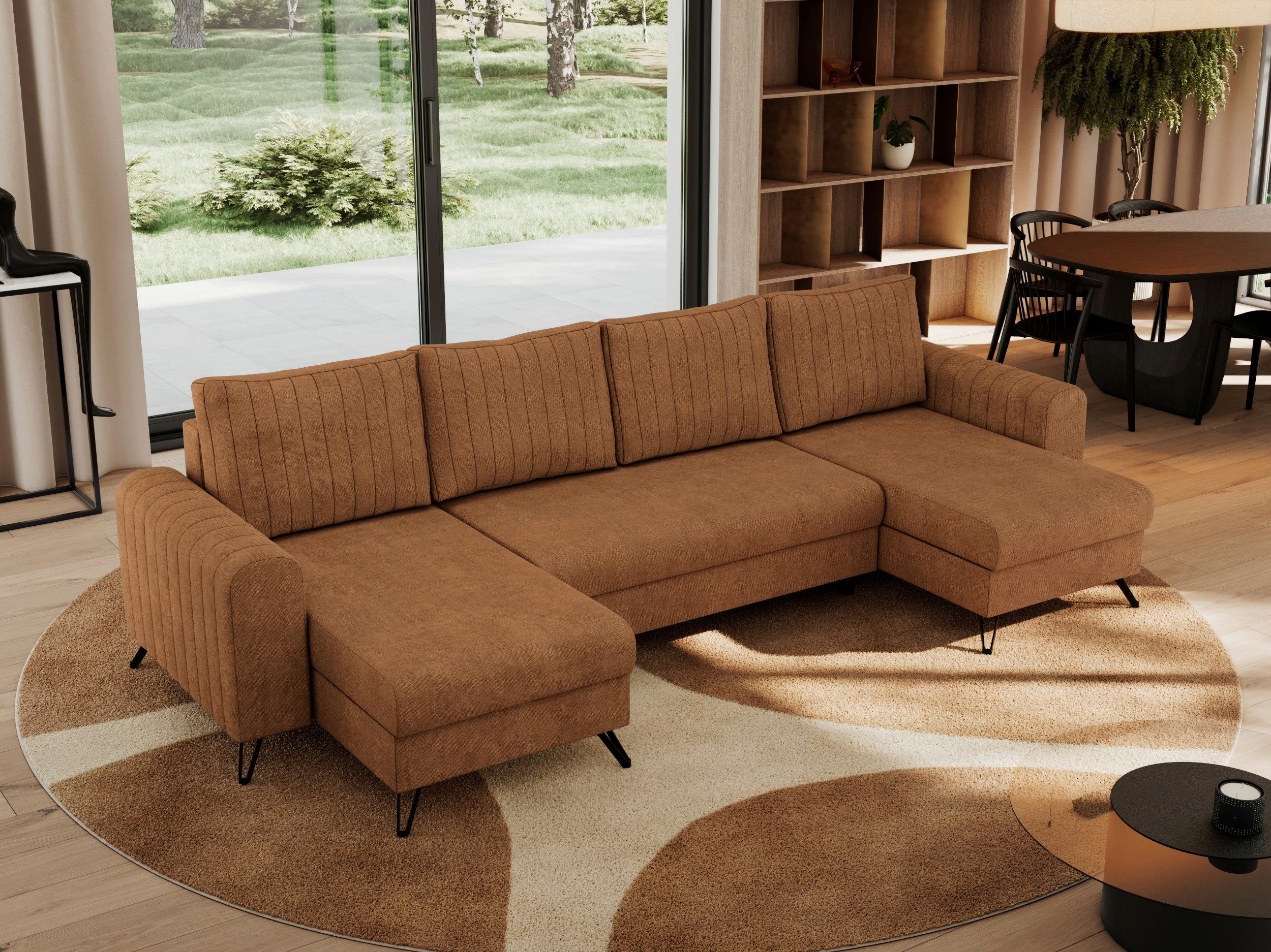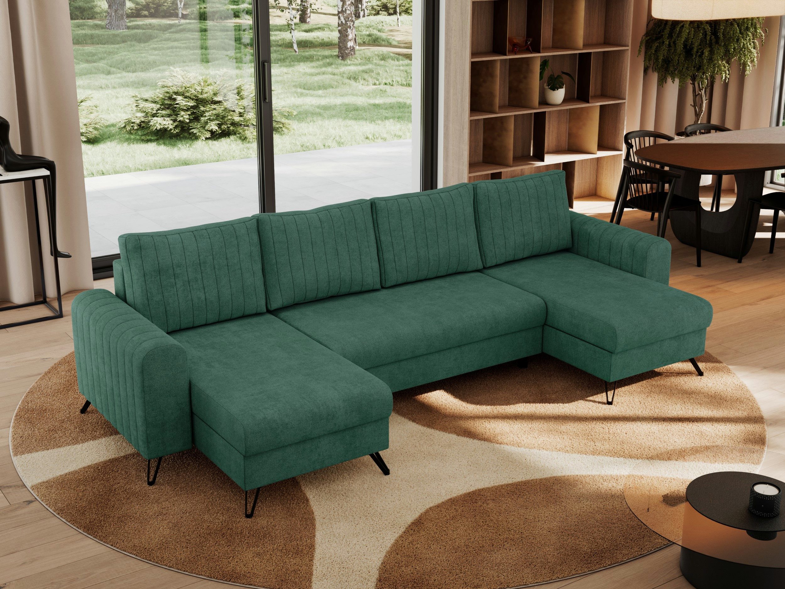 Die Sitzfläche ist mit hochwertigem T30-Schaum und Bonell-Federkern ausgestattet, was für eine optimale Balance zwischen Weichheit und Stützkraft sorgt. Das sorgt nicht nur für langanhaltenden Komfort, sondern auch für eine hohe Langlebigkeit der Polsterung. Die weichen Rückenkissen bieten zusätzlichen Komfort und machen das Schlafsofa zu einem idealen Ort der Entspannung. Das Das Besondere an der Wohnlandschaft U-form ist die vertikalen Ziernähte auf den Kissen und Armlehnen, die der U-förmigen Ecke eine stilvolle, moderne Optik verleihen. Charakteristisch für die Couch sind außerdem die abgerundeten Armlehnen.