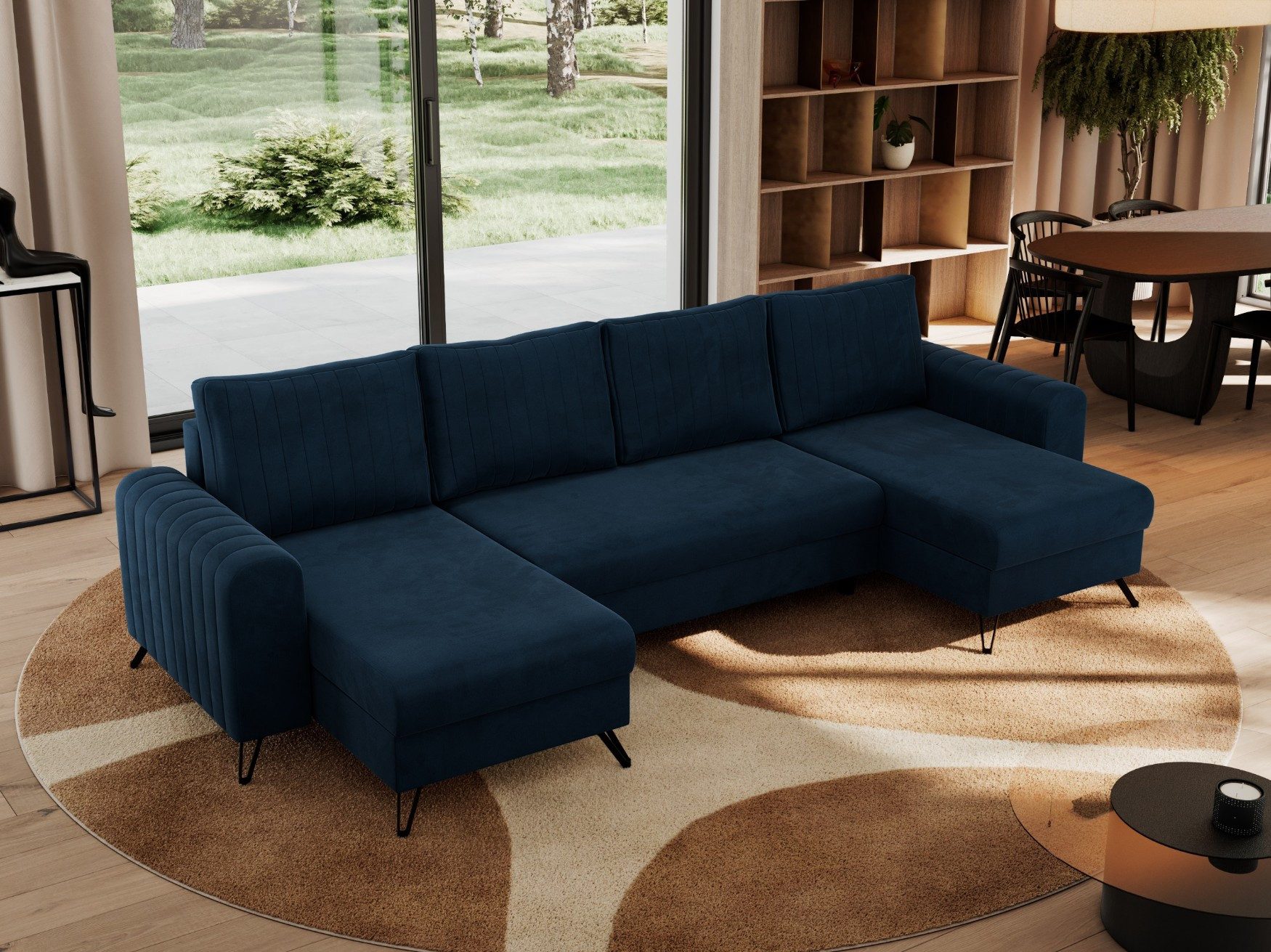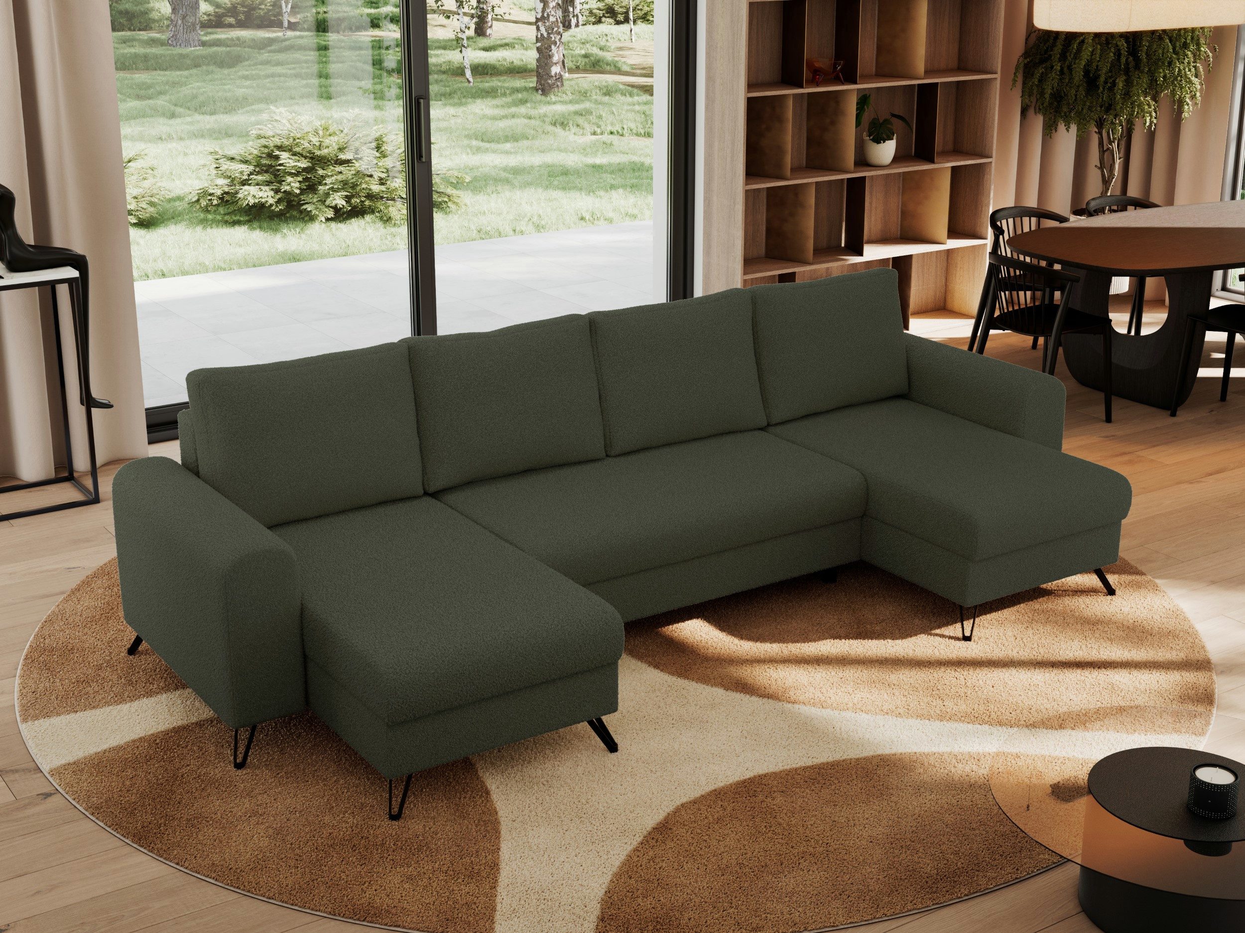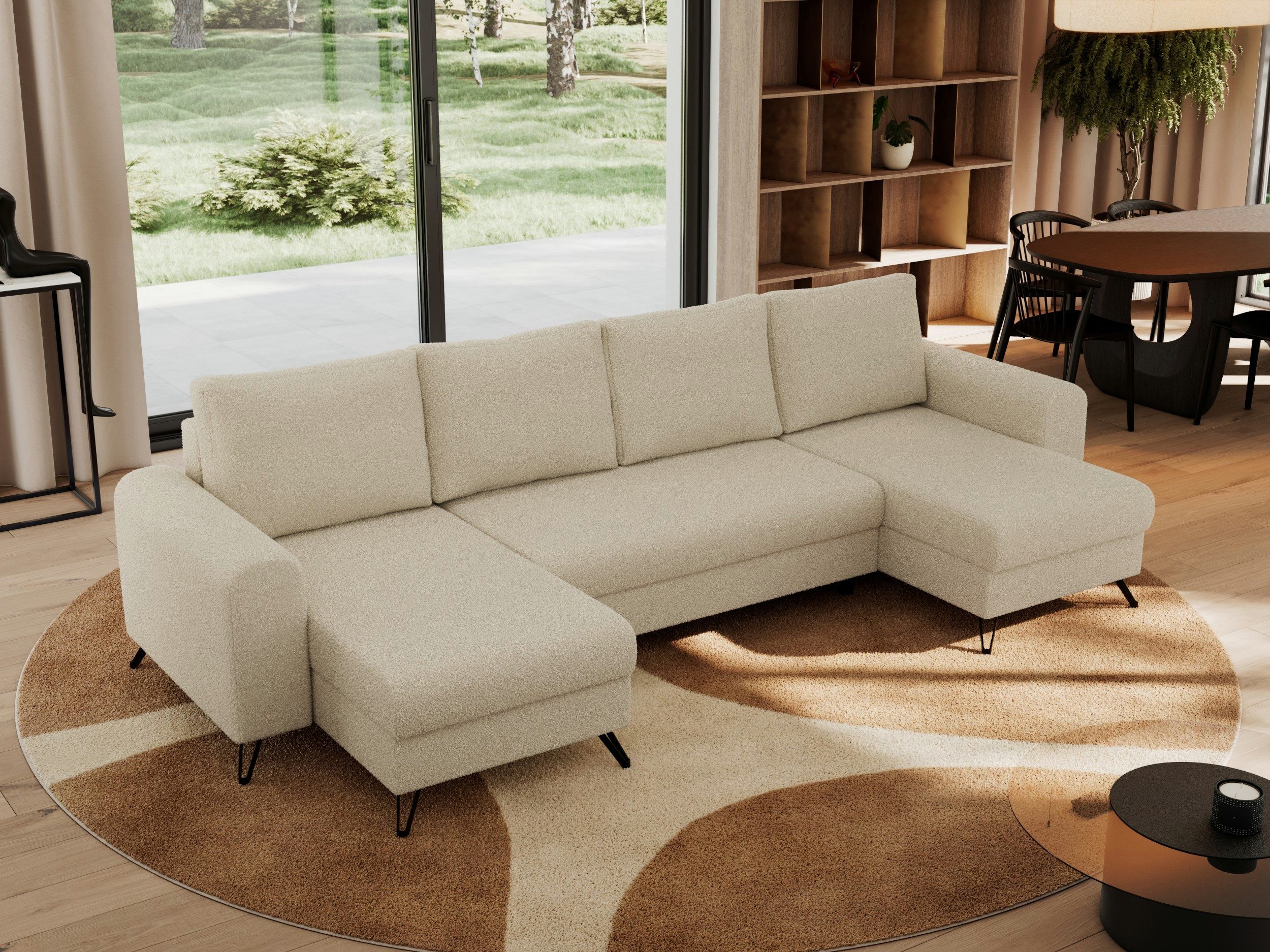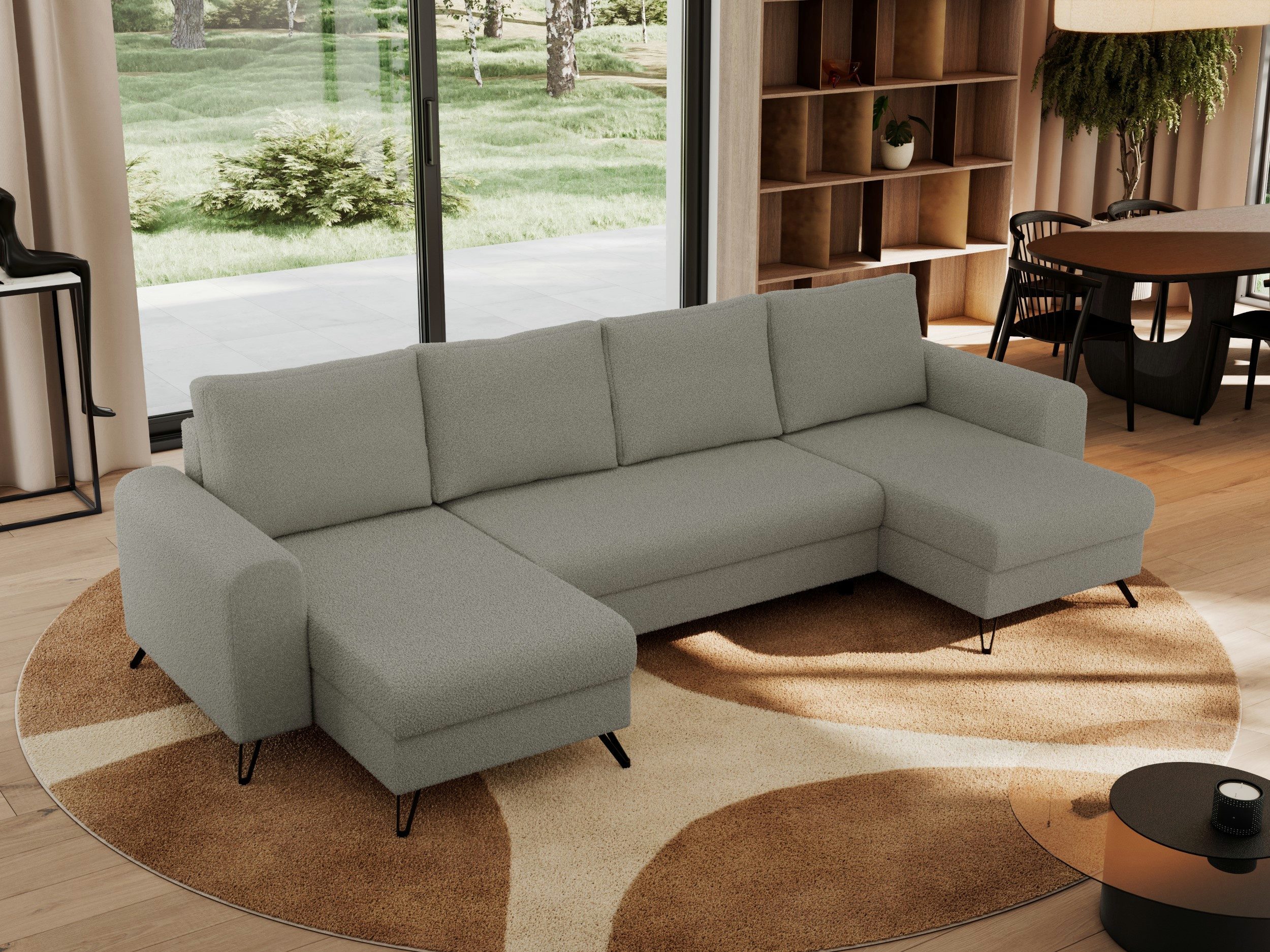 Zusätzlich bietet das Sofa U-Form drei geräumige Bettkästen, die viel Platz für Bettwäsche und Kissen haben. Dank der vollständig mit Stoff bezogenen Rückseite kann das Sofa mit Bettkästen frei im Raum platziert werden und sieht aus jeder Perspektive stilvoll aus.