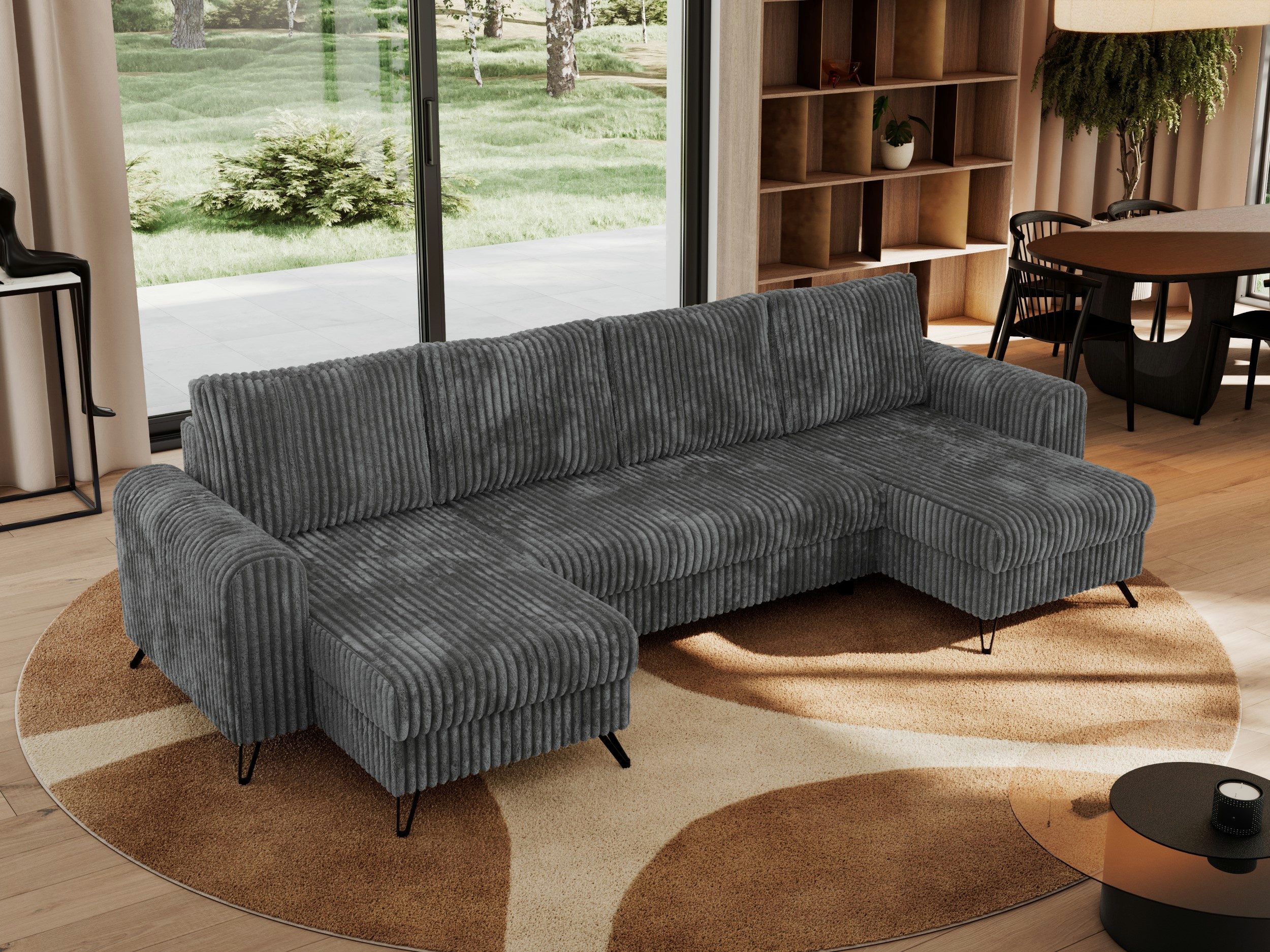 Die schwarzen Metallfüße sorgen für Stabilität und verleihen dem Big Sofa mit Schlaffunktion einen modernen, eleganten Look. Die Schlafcouch mit Bettkästen ist die perfekte Wahl für alle, die eine Kombination aus Design, Komfort und Funktionalität suchen – es ist ein wahrer Highlight für jedes Wohnzimmer.