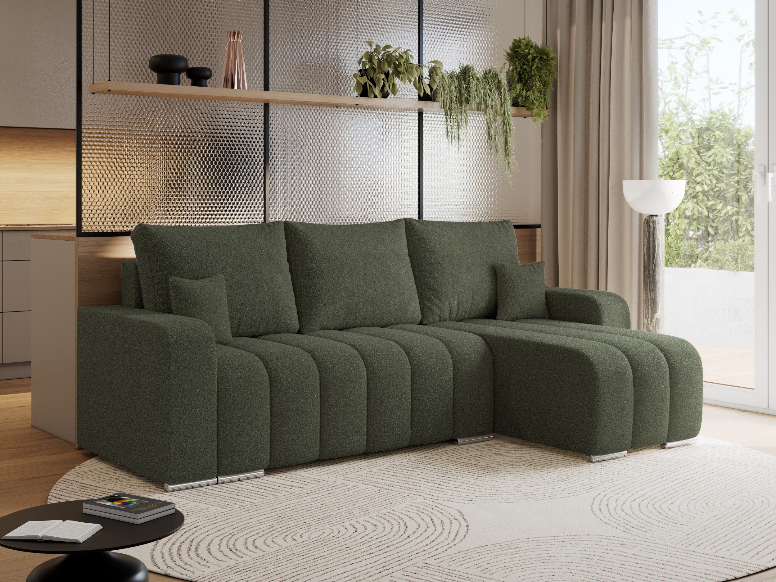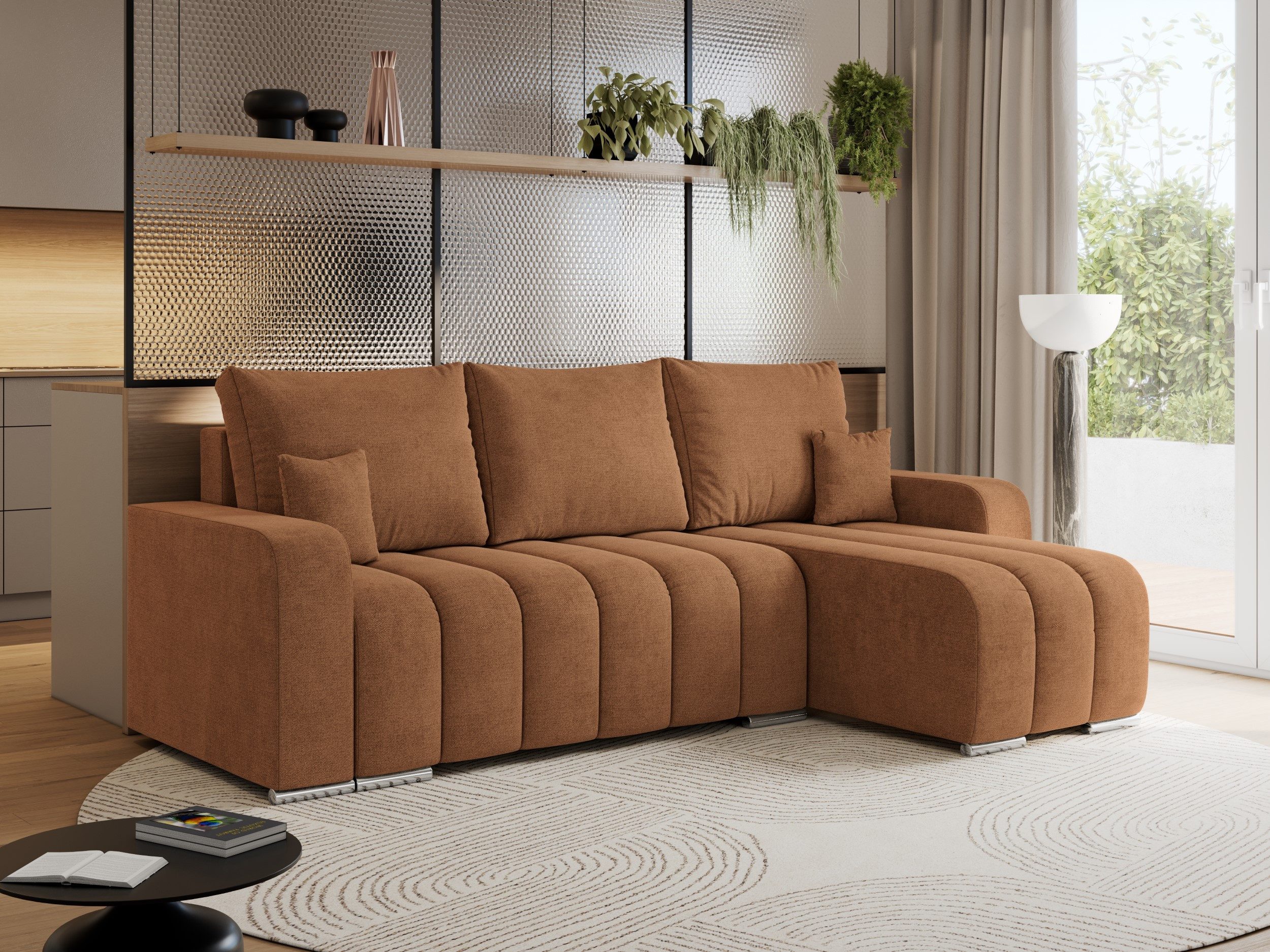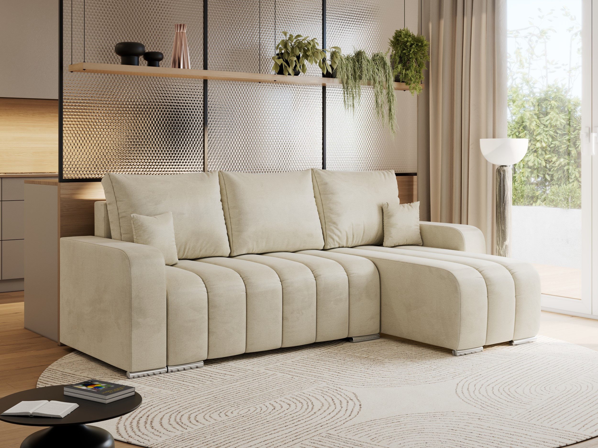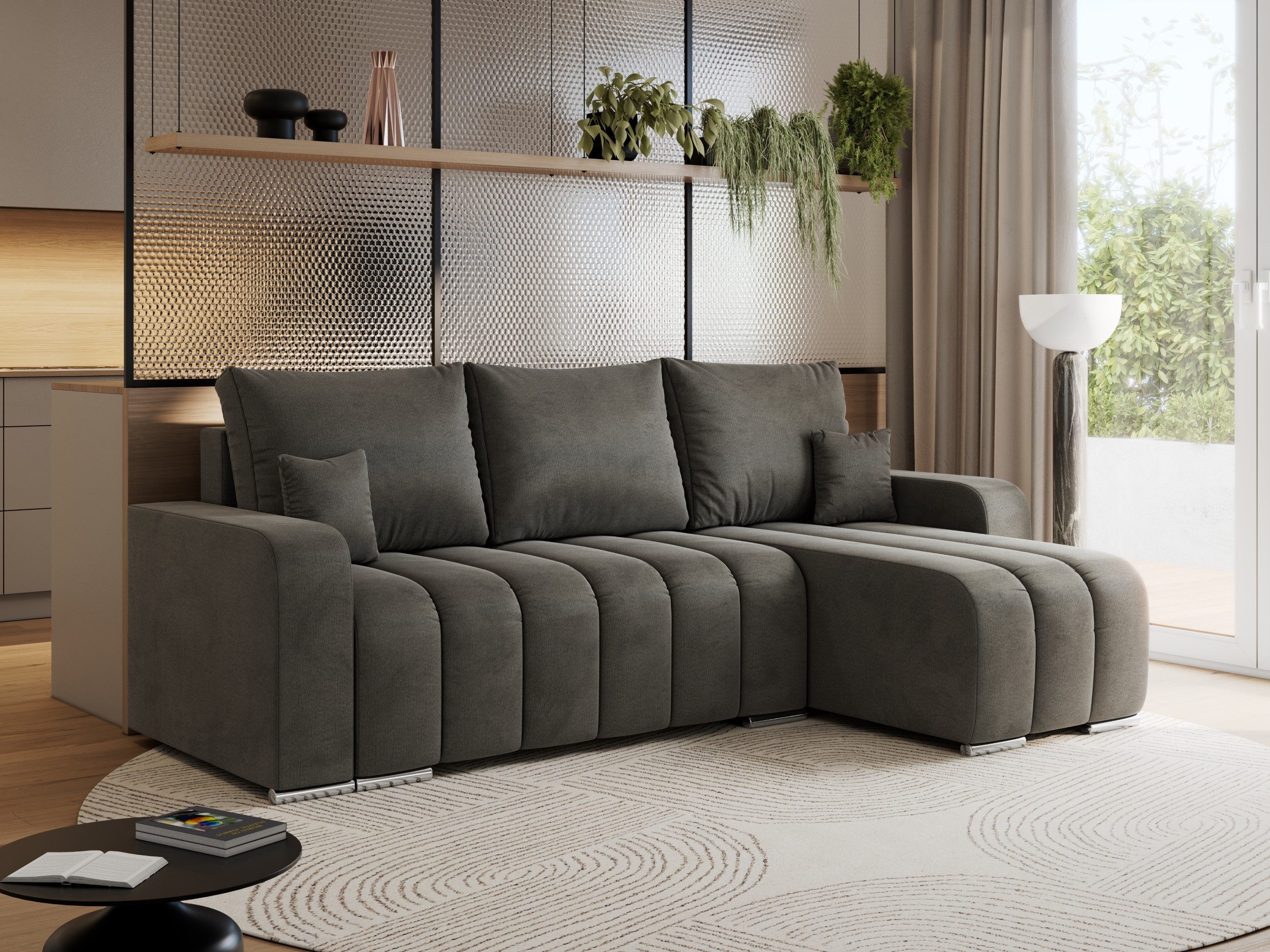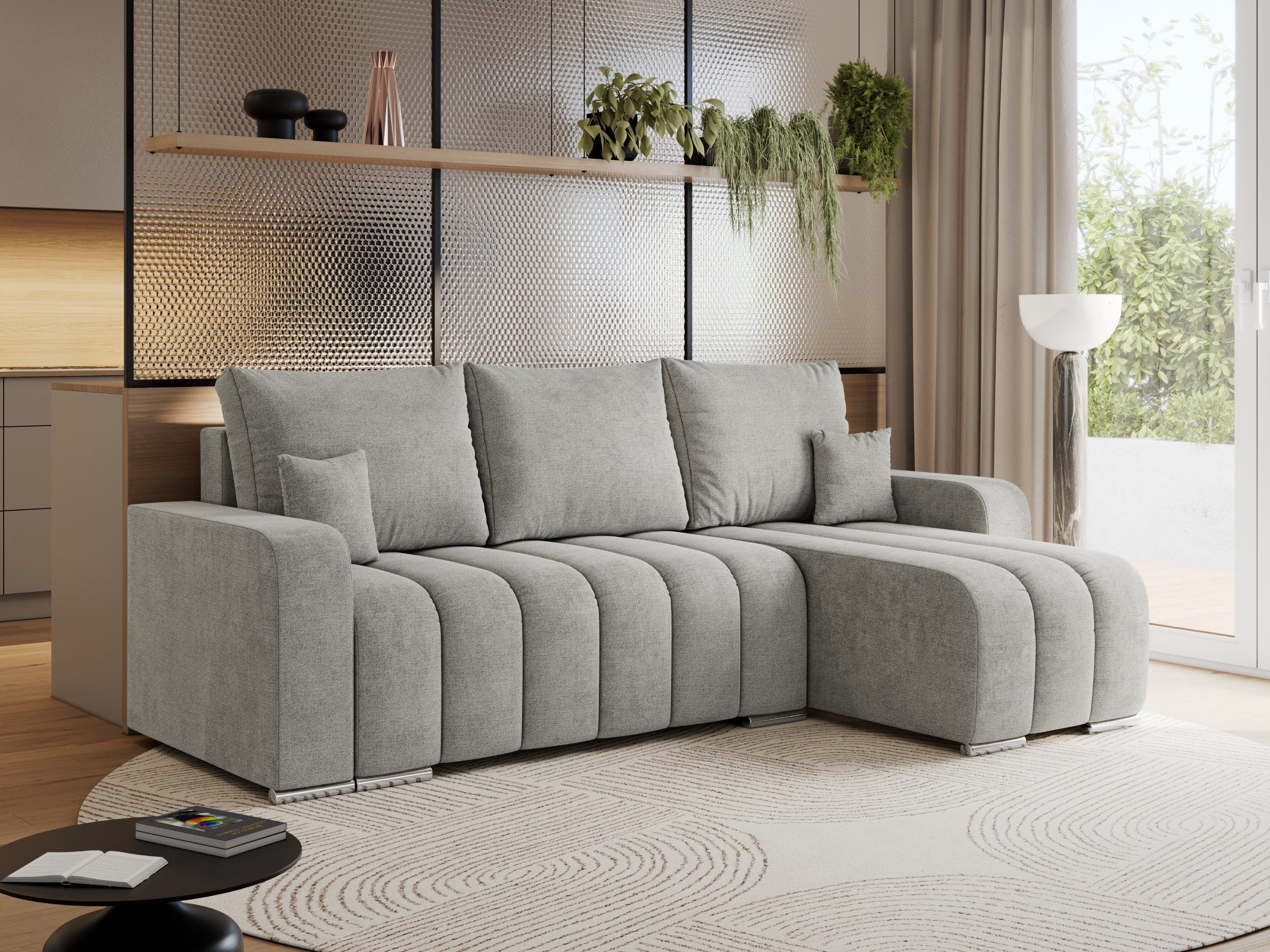 Das Ecksofa KIRASSO vereint modernes Design mit Funktionalität und Komfort. Dank seiner eleganten Form passt diese Couch L-Form perfekt in jedes Wohnzimmer und bietet ausreichend Platz. Die Füllung der Schlafcouch besteht aus hochwertigem T30-Schaum, der für langanhaltenden Sitzkomfort sorgt und sich der Körperform anpasst. Metallbeine verleihen dem Schlafsofa ein modernes Aussehen und Langlebigkeit. Sie werden nicht gleichgültig daran vorbeigehen.