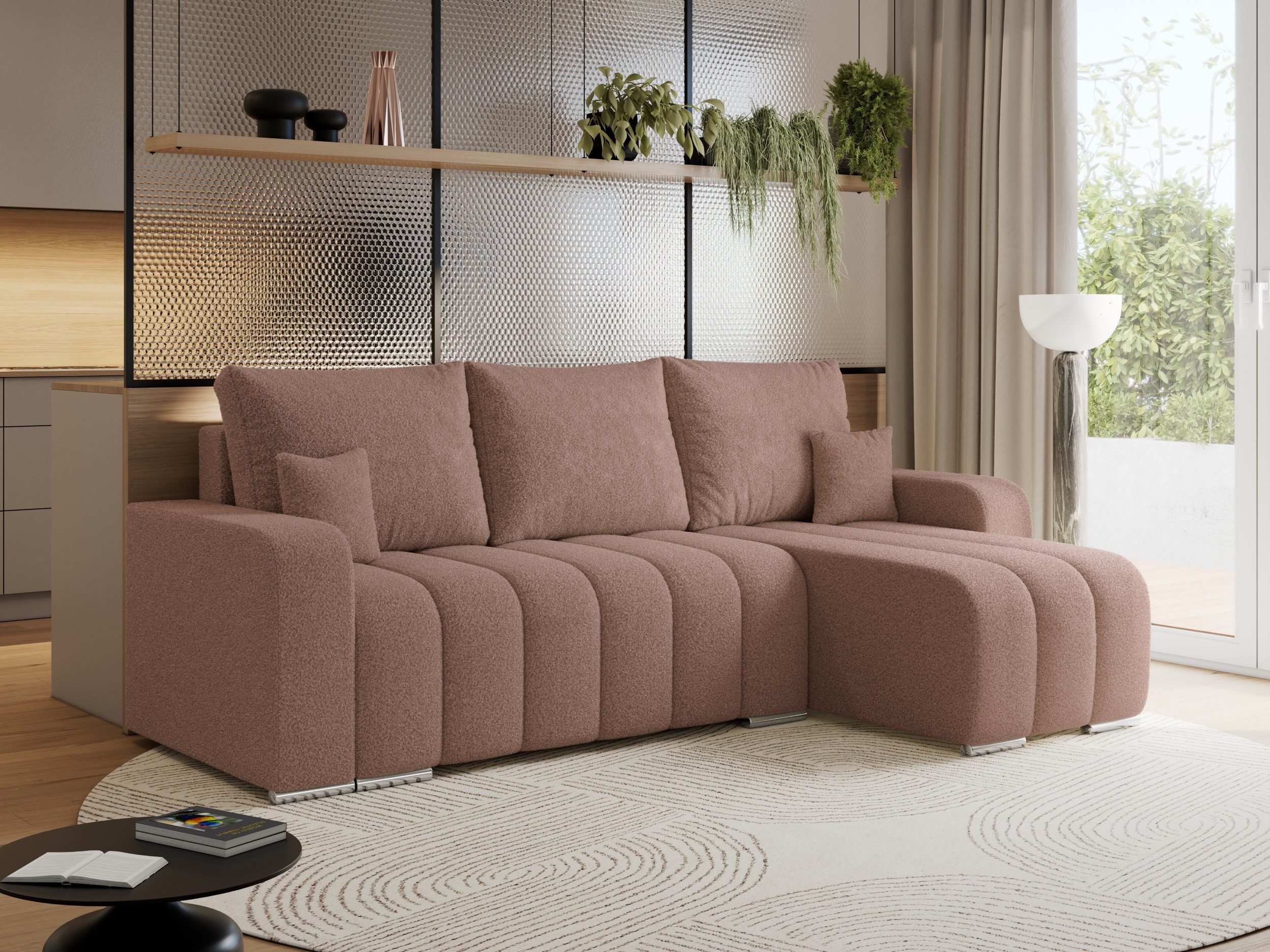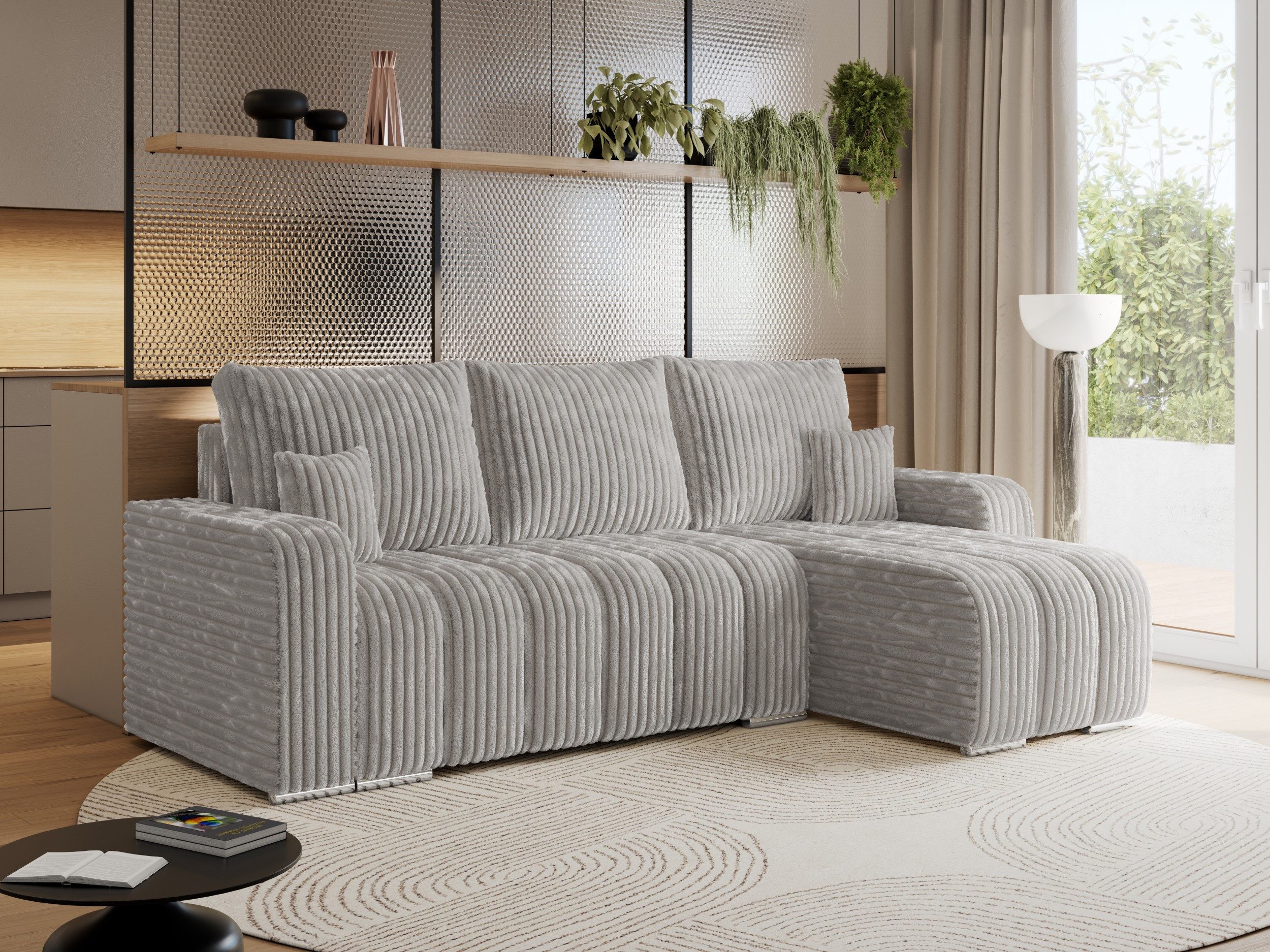 Das universelle Design ist besonders praktisch, da Sie die Ausrichtung das Ecksofa mit Schlaffunktion bei der Montage frei wählen können. Großzügige Rückenpolster sorgen für zusätzlichen Komfort. Das Design des Sofas L-Form wird durch kleine, vertikale Ziernähte auf der Sitzfläche ergänzt, die ihm einen stilvollen und eleganten Charakter verleihen.