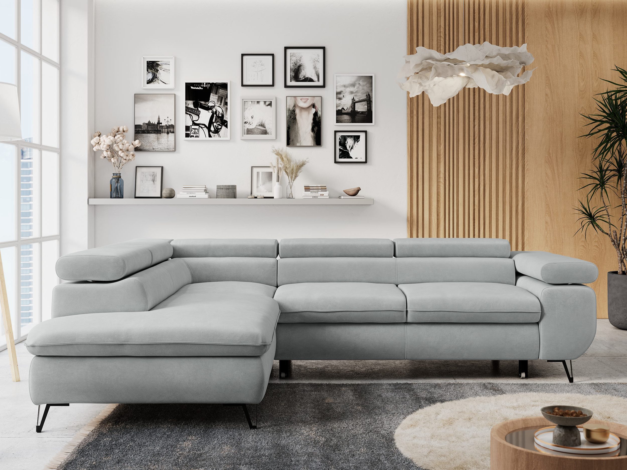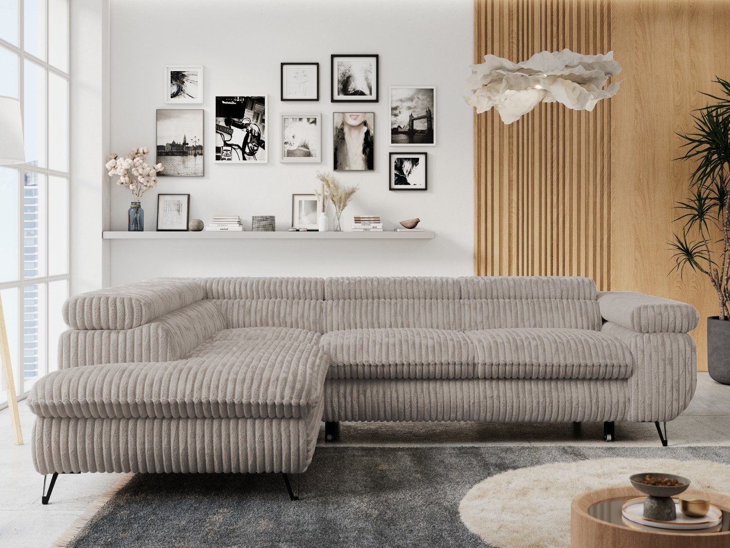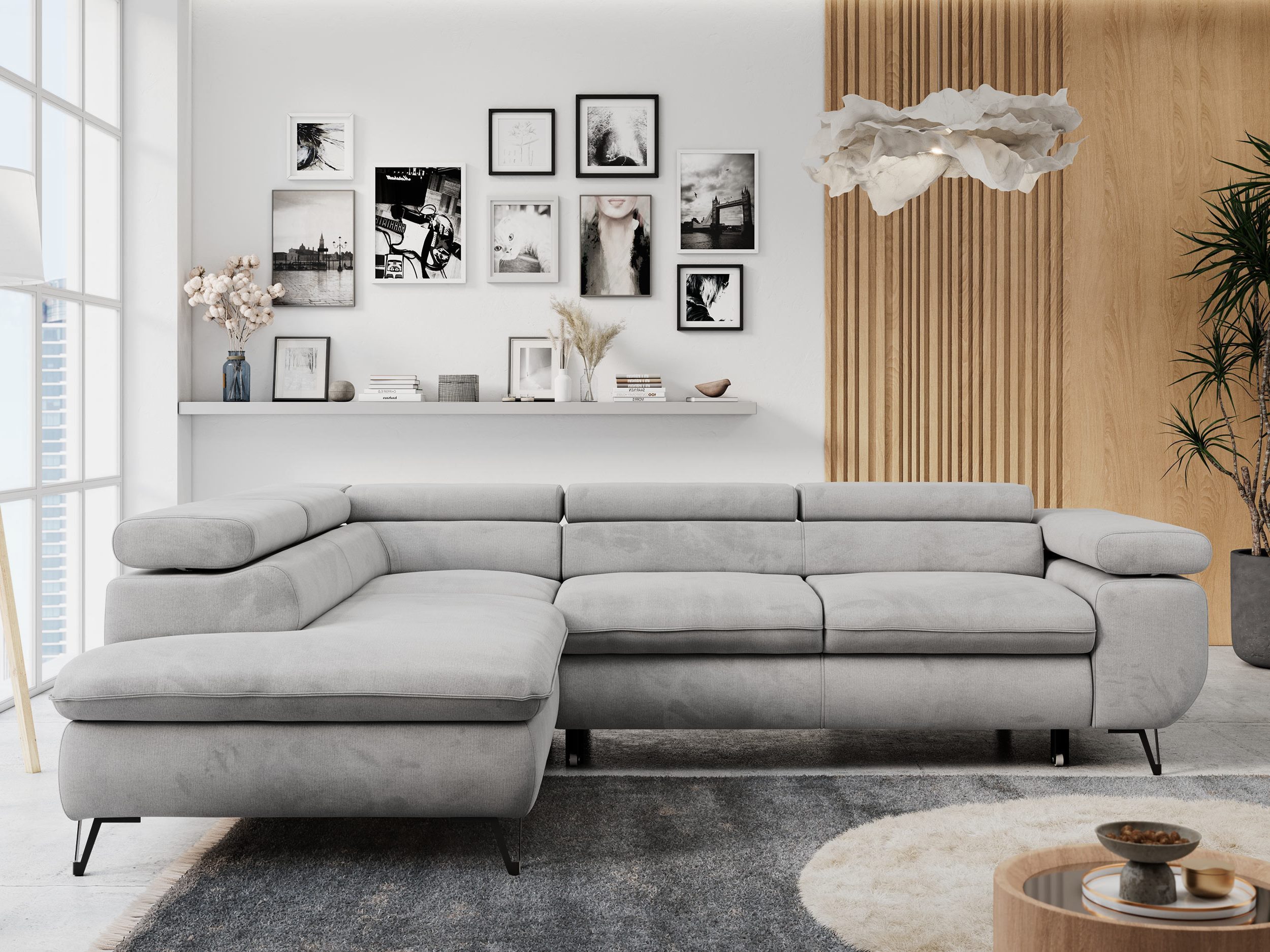 Die L-förmige Ecke verfügt über einen praktischen Bettkasten, der ausreichend Stauraum. Die integrierte Schlaffunktion mit einem Delfin-Mechanismus ermöglicht ein einfaches und schnelles Ausklappen zu einer bequemen Liegefläche – ideal für Gäste oder den täglichen Gebrauch.