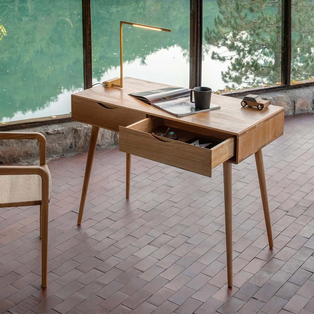 Der Mobello Schreibtisch Primera aus edlem Eichen-Massivholz verbindet Ästhetik mit Funktionalität und ist somit die perfekte Wahl für jedes moderne Heimbüro oder Jugendzimmer. Seine klaren Linien und die natürliche Holzmaserung machen diesen Bürotisch zu einem echten Blickfang.