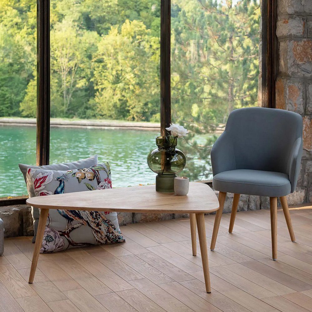 Der Mobello Primera Clubtisch / Couchtisch bringt mit seiner einzigartigen Dreieckform einen modernen und dennoch rustikalen Akzent in Ihr Wohnzimmer. Gefertigt aus massiver Eiche, überzeugt dieser Tisch durch seine natürliche Maserung und abgerundeten Ecken, die ihm eine warme und einladende Optik verleihen. Die sorgfältige Handarbeit und die hochwertige Verarbeitung machen diesen Tisch zu einem langlebigen und stilvollen Begleiter in jedem Raum.