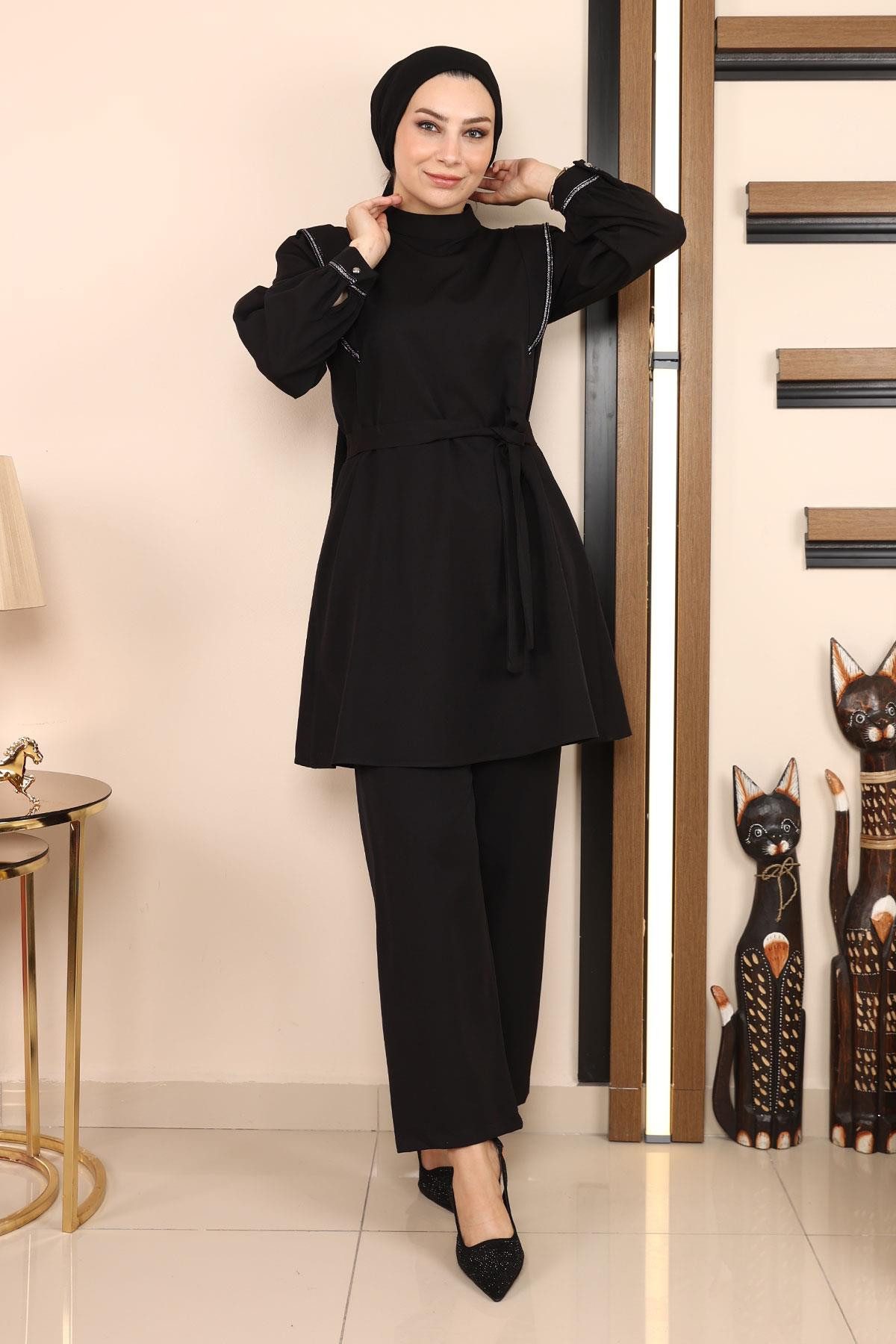 Stoffmerkmal: Hergestellt aus doppelter Stofflage.Produktmerkmal: Dies ist ein neues Hijab-Modeartikel der Saison ohne Futter. Die Tunika hat einen Rückenreißverschluss und einen Knopf. Die Schulter und Manschette haben Banddetails. Die Manschettenknöpfe sind funktional. Der Gürtel ist verstellbar. Die Hose hat einen elastischen Bund. Aufgrund von Konzeptaufnahmen kann es leichte Farbabweichungen im Produkt geben. Das Model trägt Размер 38.Размер 38 Tunika Maße: Длина: 87 cm - Brust