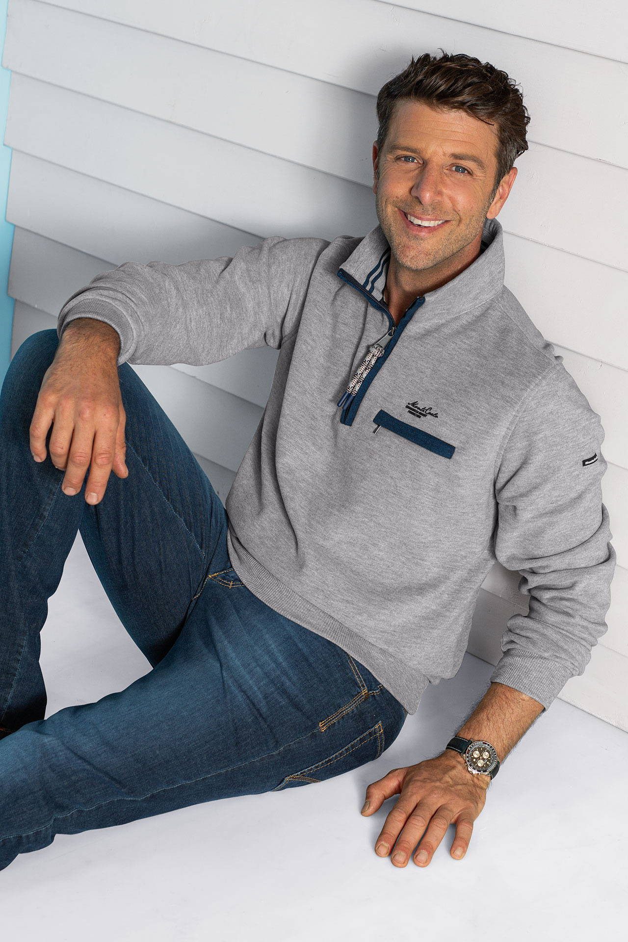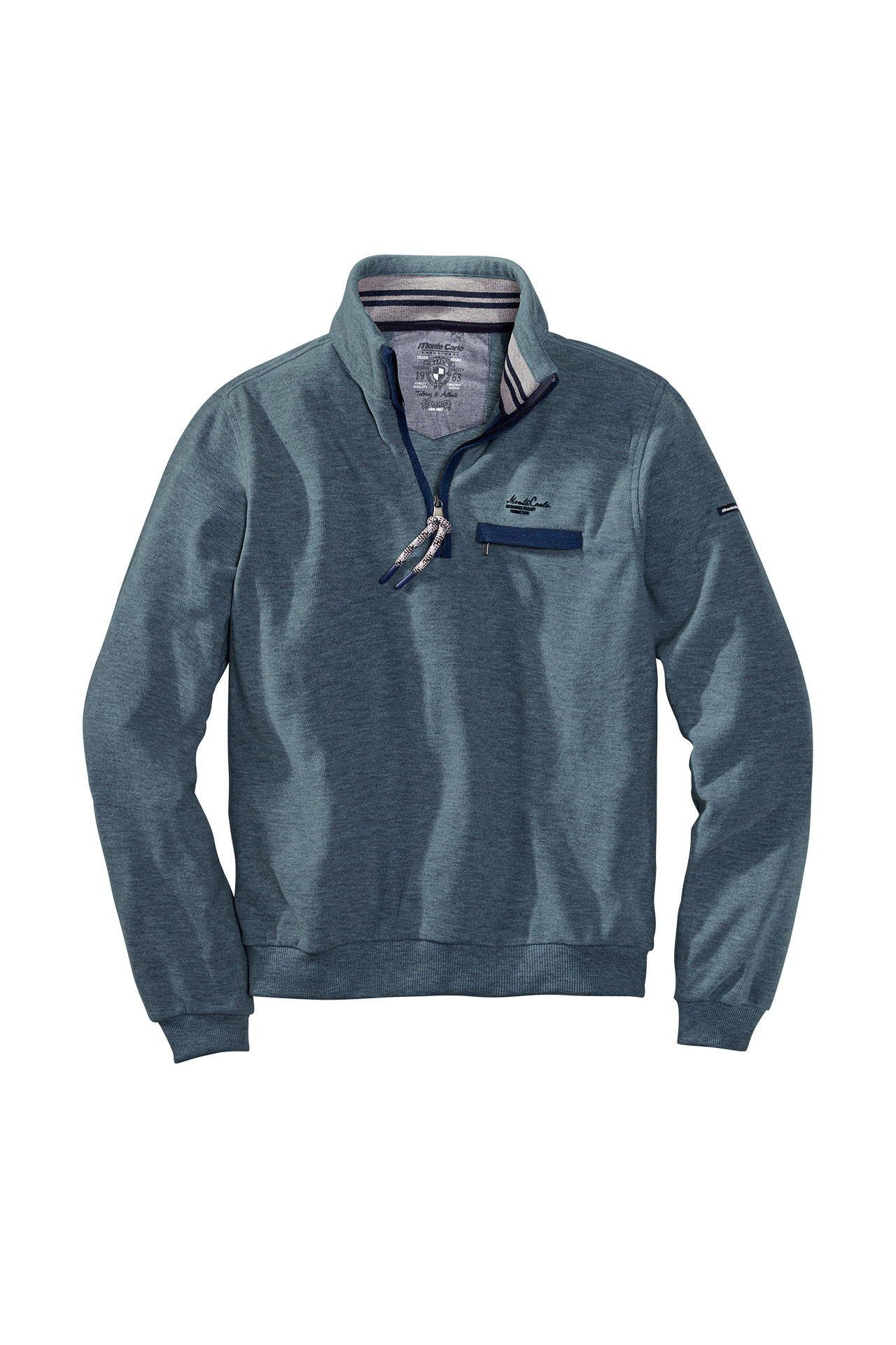 Dieses Sweatshirt in großen Größen bietet hohen Tragekomfort und ist aus einem weichen Materialmix von 60% Baumwolle und 40% Polyester gefertigt. Das Modell besticht durch seine kräftige, bordeauxrote Farbe und den sportlich-lässigen Troyer-Kragen mit Reißverschluss. Der Kragen ist mit auffälligen Streifen in Blau und Weiß abgesetzt, was dem Sweatshirt einen maritimen Look verleiht.