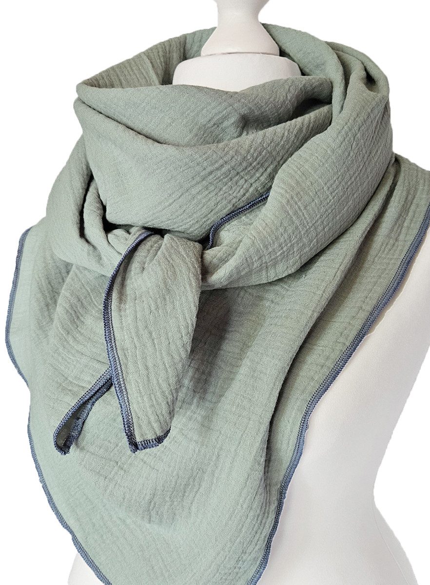 Das Einfarbige Musselintuch mit Kontrastnaht macht das Halstuch zu einem echten Blickfang.