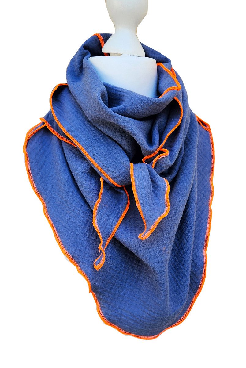 Handmade Musselin Dreieckschal JEANSBLAU (Kontrastnaht Neonorange)