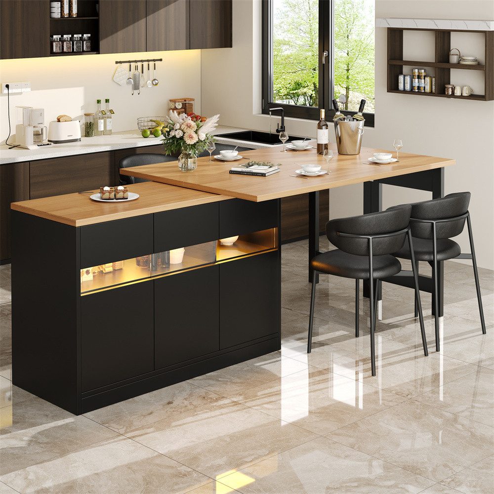 Die Höhe ist zwischen 120–180 cm verstellbar. Die ausziehbare Tischplatte passt sich flexibel an unterschiedliche Situationen an – vom Sideboard über Bar-Tisch bis zum Esstisch.