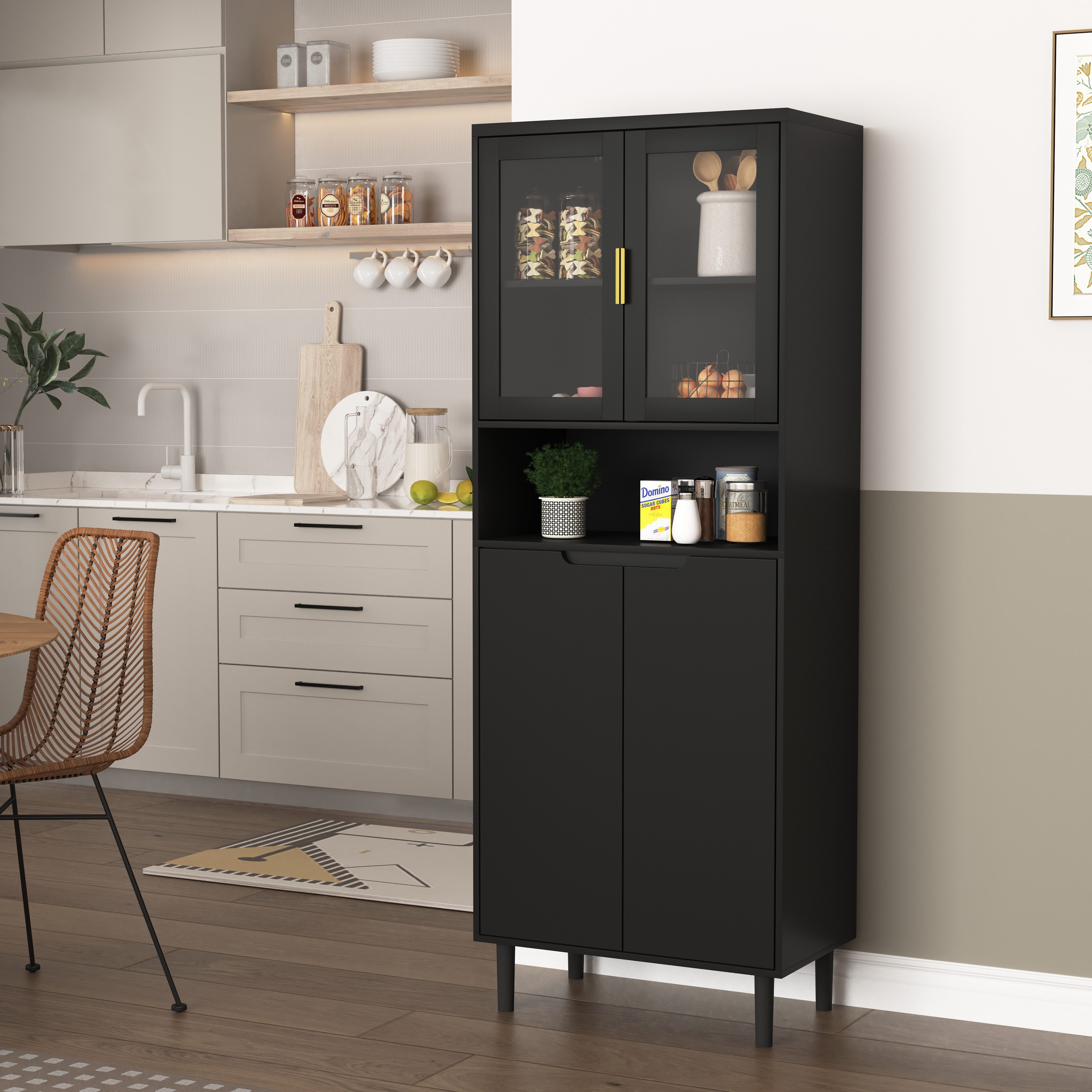 Das elegante, schwarze Design verleiht dem Möbelstück ein modernes Erscheinungsbild. Als Vitrine im Wohnzimmer, Buffetschrank im Esszimmer oder Aktenschrank im Homeoffice – dieser Schrank passt sich Ihrer Einrichtung stilvoll an.