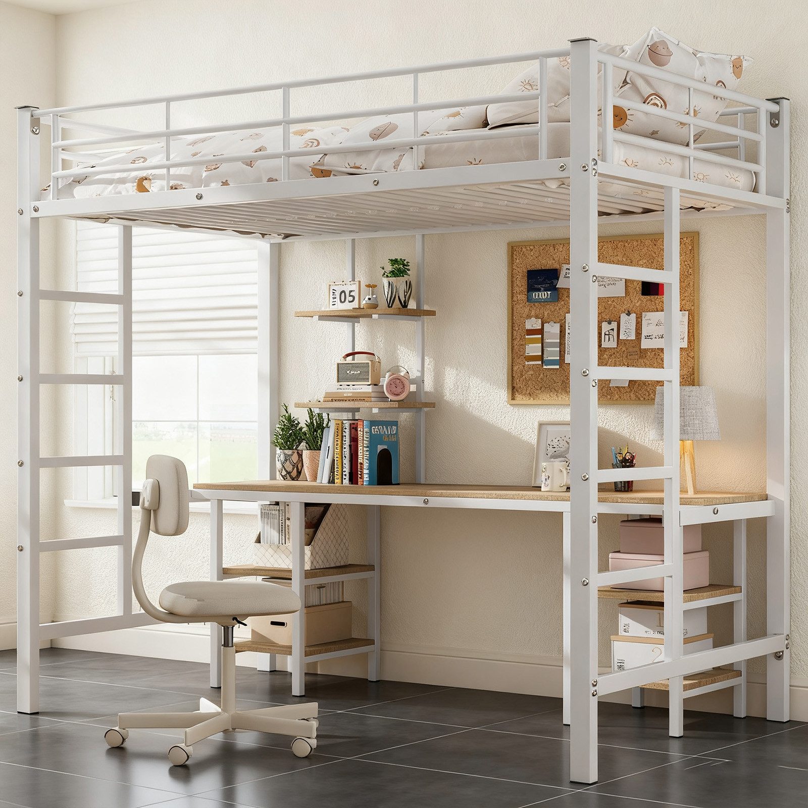 Die gerade Leiter mit drei stabilen Stufen erleichtert den Zugang zum oberen Bett und stellt sicher, dass Ihre Kinder sicher auf- und absteigen können. Diese funktionale Leiter fügt sich nahtlos in das Design ein und ist einfach zu bedienen. Der Tisch und die Regale bieten eine ideale Lösung für alle, die zusätzlichen Stauraum und Arbeitsfläche benötigen.