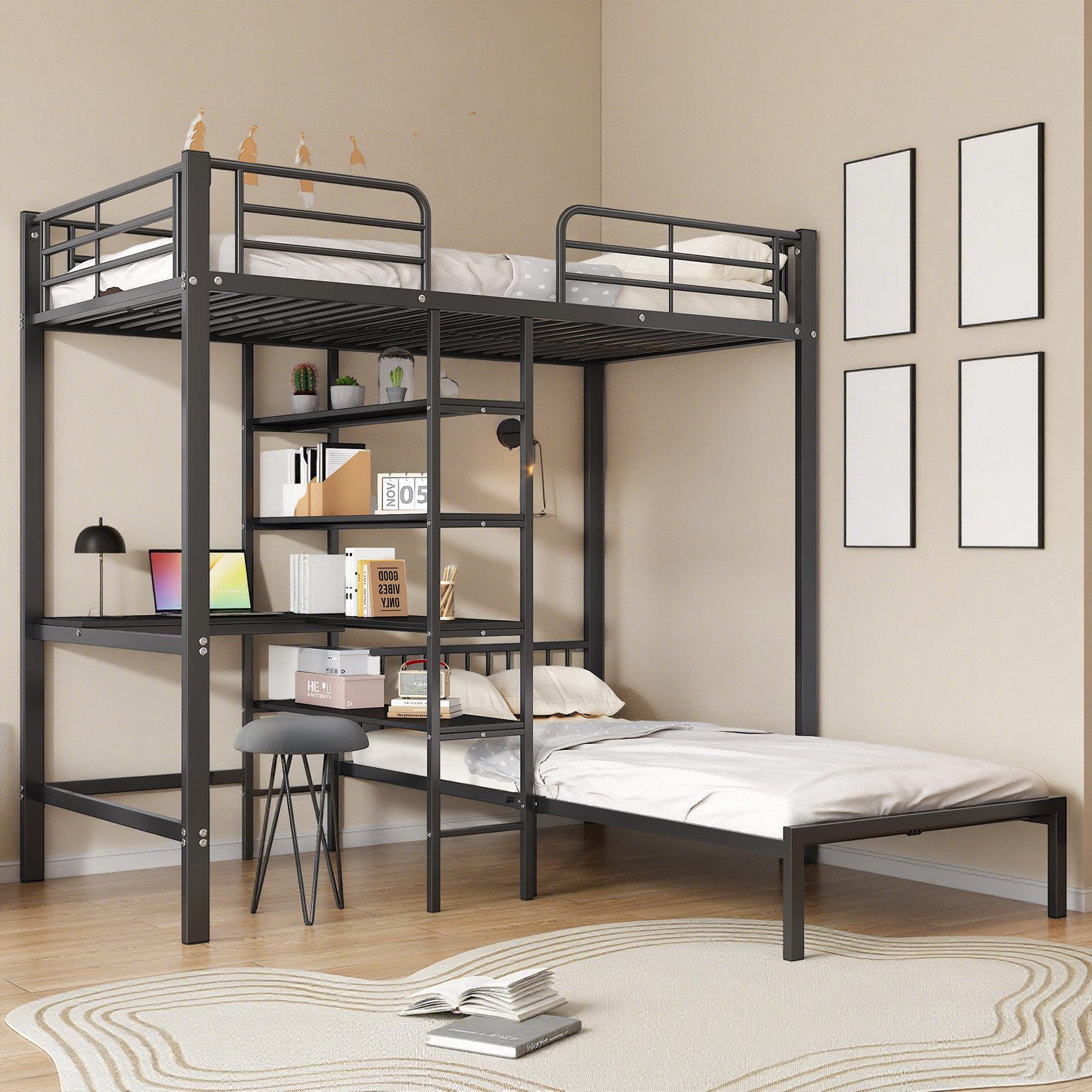 Ausstattung | Eisenbett Funktionsbett Stauraumbett Kinderbett mit Tisch und Regalen mit fünfstufige rechtwinklige Leiter, vier Seitengitter am oberen Bett |