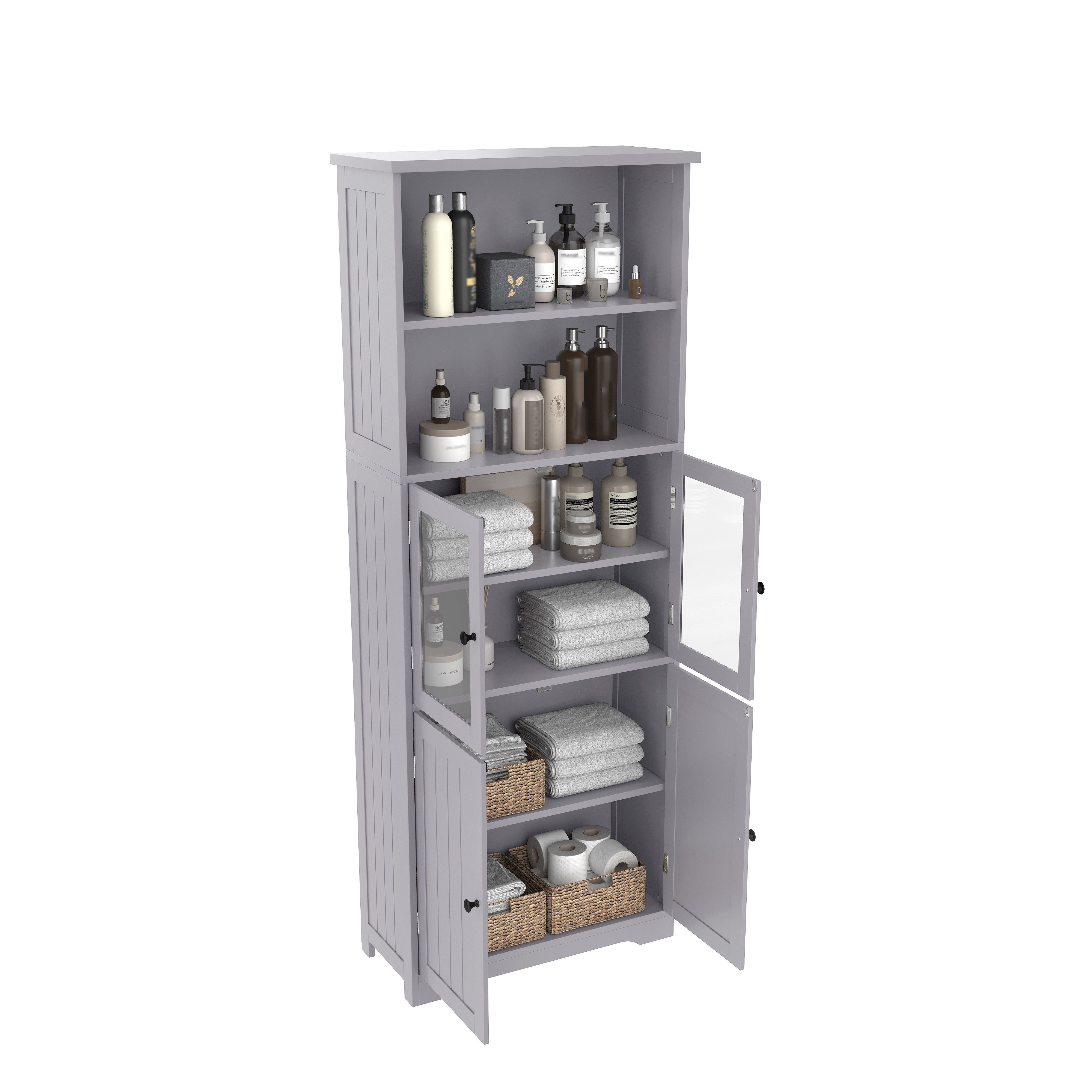Mit zwei offenen Ablagefächern und zwei Schranktüren (eine Glas- und eine Holzoberfläche) bietet der Schrank eine Vielzahl von Aufbewahrungsoptionen. Die Glastür ermöglicht eine schnelle Einsicht in Ihre gelagerten Artikel, während die Holzschranktüren für den unsichtbaren Stauraum sorgen, um Ihren Raum ordentlich zu halten. So können Sie Handtücher, Kosmetik, Reinigungsmittel und andere Badezimmerprodukte problemlos verstauen.