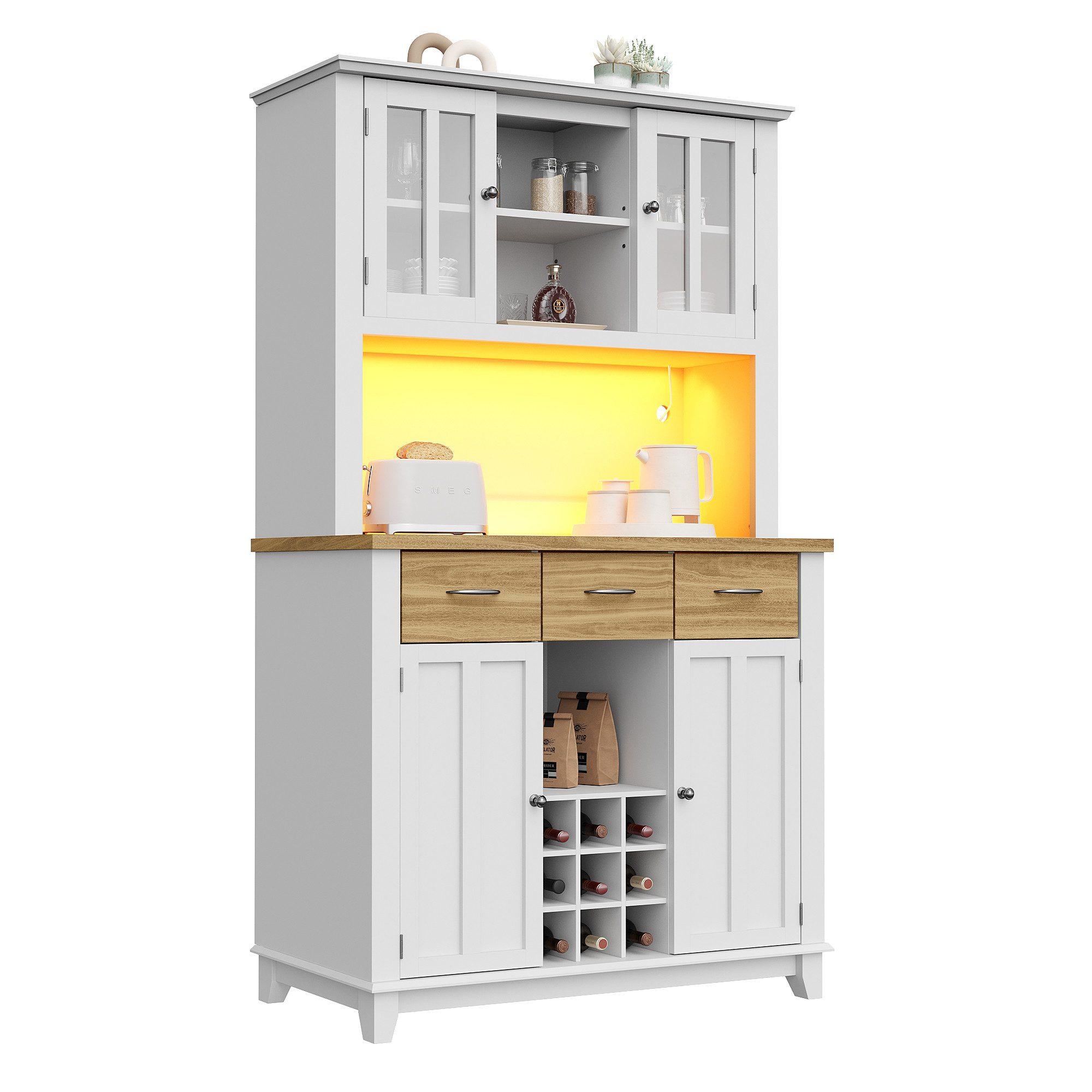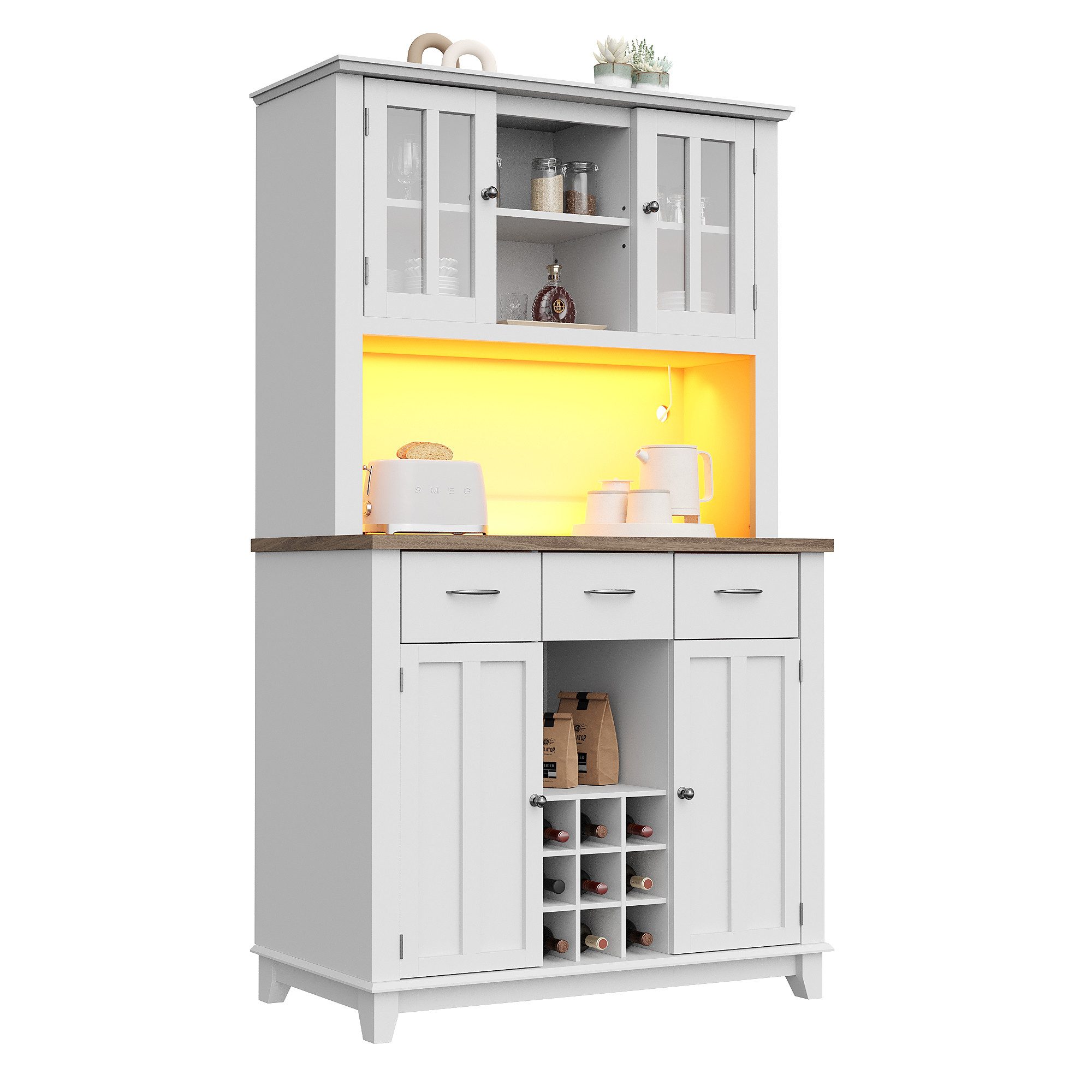 Der MODFU Hochschrank ist die perfekte Ergänzung für Ihre Küche oder Ihr Wohnzimmer, um Stauraum und Stil zu vereinen. Mit einer Размер von 106 x 40 x 179,5 cm bietet der Schrank reichlich Platz für Ihre Küchenutensilien und Lebensmittel. Das integrierte LED-Beleuchtungssystem sorgt dafür, dass alle Gegenstände gut sichtbar sind, während die 6 oberen Ablagefächer und der geräumige Unterschrank für eine geordnete Aufbewahrung sorgen. Das Weinregal bietet Platz für 9 Flaschen, und die Kippschutzvorrichtung sorgt für zusätzliche Sicherheit, besonders in Haushalten mit Kindern. Der Schrank ist aus robustem MDF-Material gefertigt und mit Aluminiumlegierungsgriffen ausgestattet, die Stabilität und Langlebigkeit garantieren. Dank seines vielseitigen Designs kann er auch als elegante Vitrine im Wohnzimmer genutzt werden.
