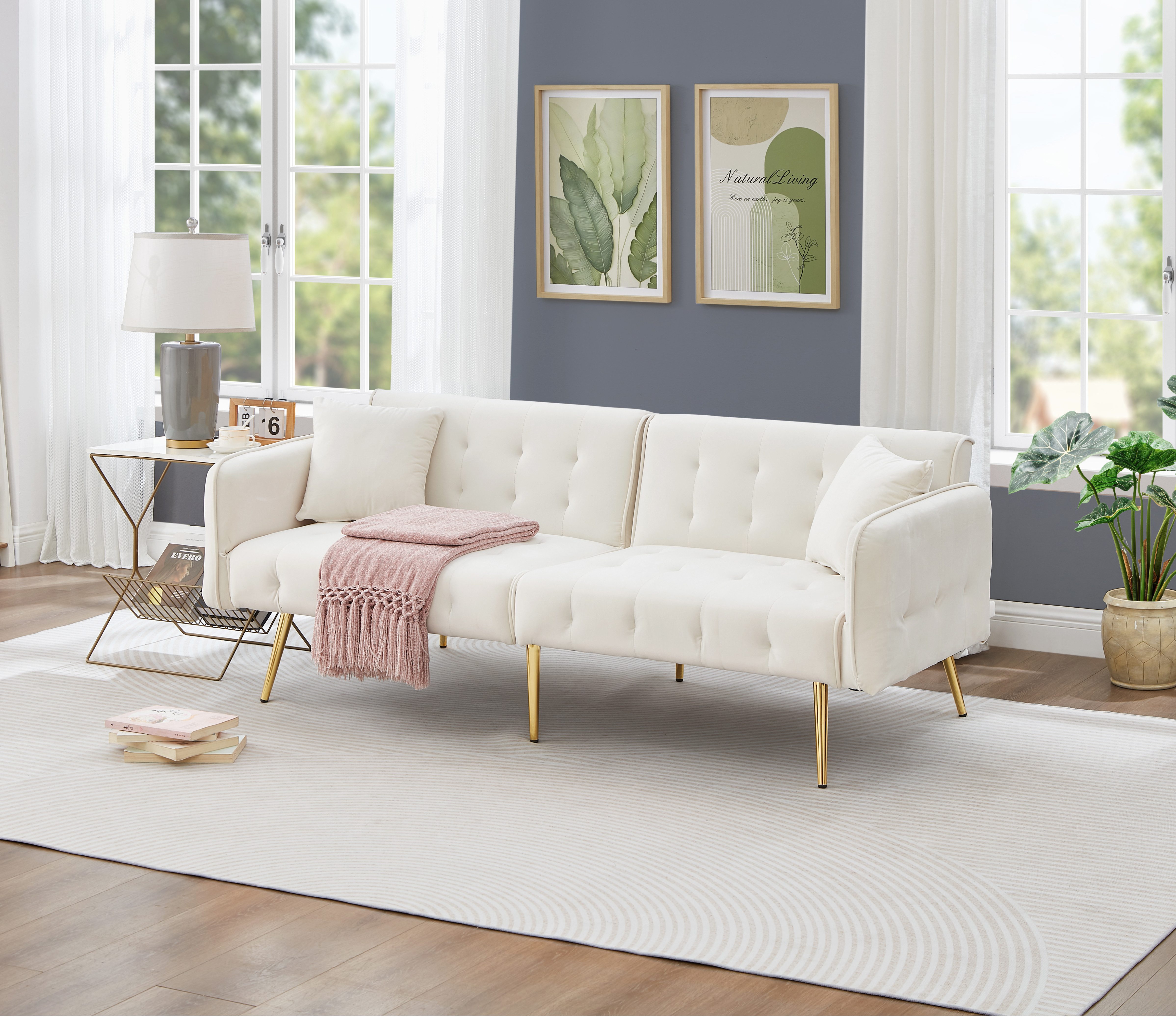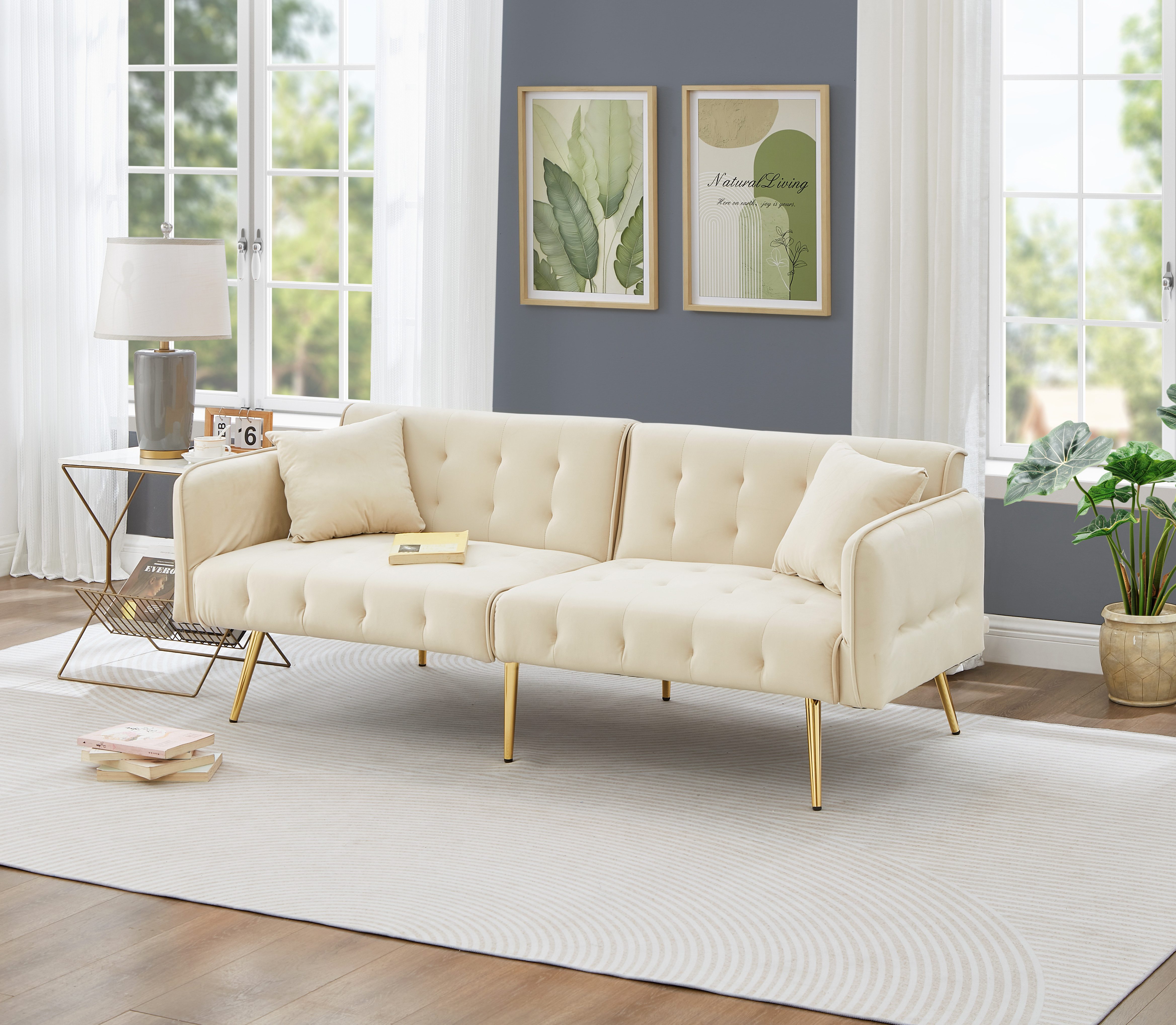 Die 6 vergoldeten Metallfüße verleihen dem Sofa einen Hauch von Luxus und sorgen gleichzeitig für eine stabile Basis. Der bodenfreie Aufbau ermöglicht eine unkomplizierte Reinigung, insbesondere in engen Räumen, und sorgt für eine einfache Pflege. Das minimalistische, moderne Design passt sich nahtlos in jedes Wohnzimmer oder Gästezimmer an.