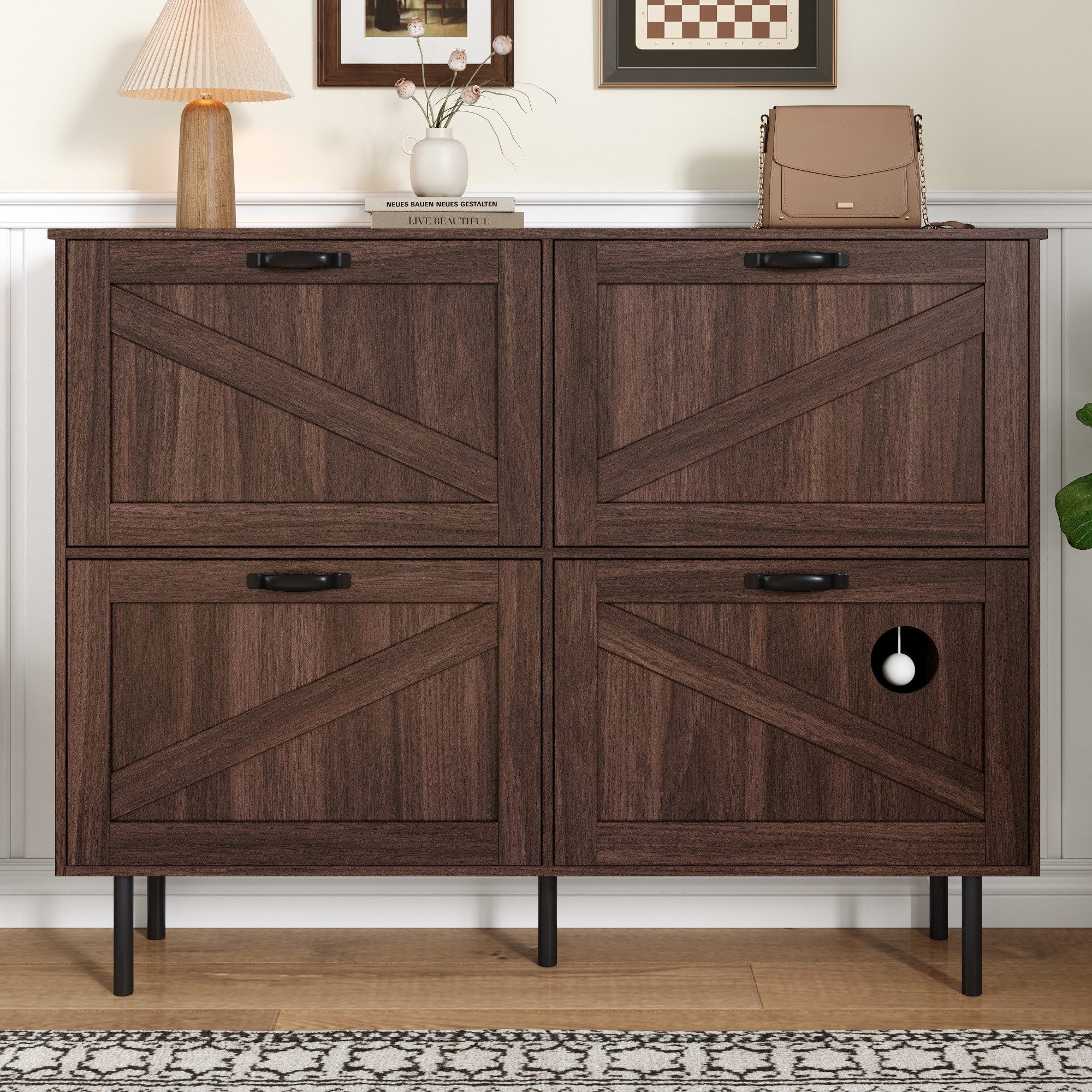 Dieser Schuhschrank aus edlem Walnussholz ist nicht nur ein praktisches Möbelstück, sondern auch ein Design-Highlight in Ihrem Zuhause. Die vier Türen bieten eine durchdachte Aufbewahrungslösung für 7–9 Paar Schuhe, die durch die hochklappbaren Regale einfach organisiert werden können. Damit bleibt der Schuhbereich stets ordentlich und aufgeräumt.