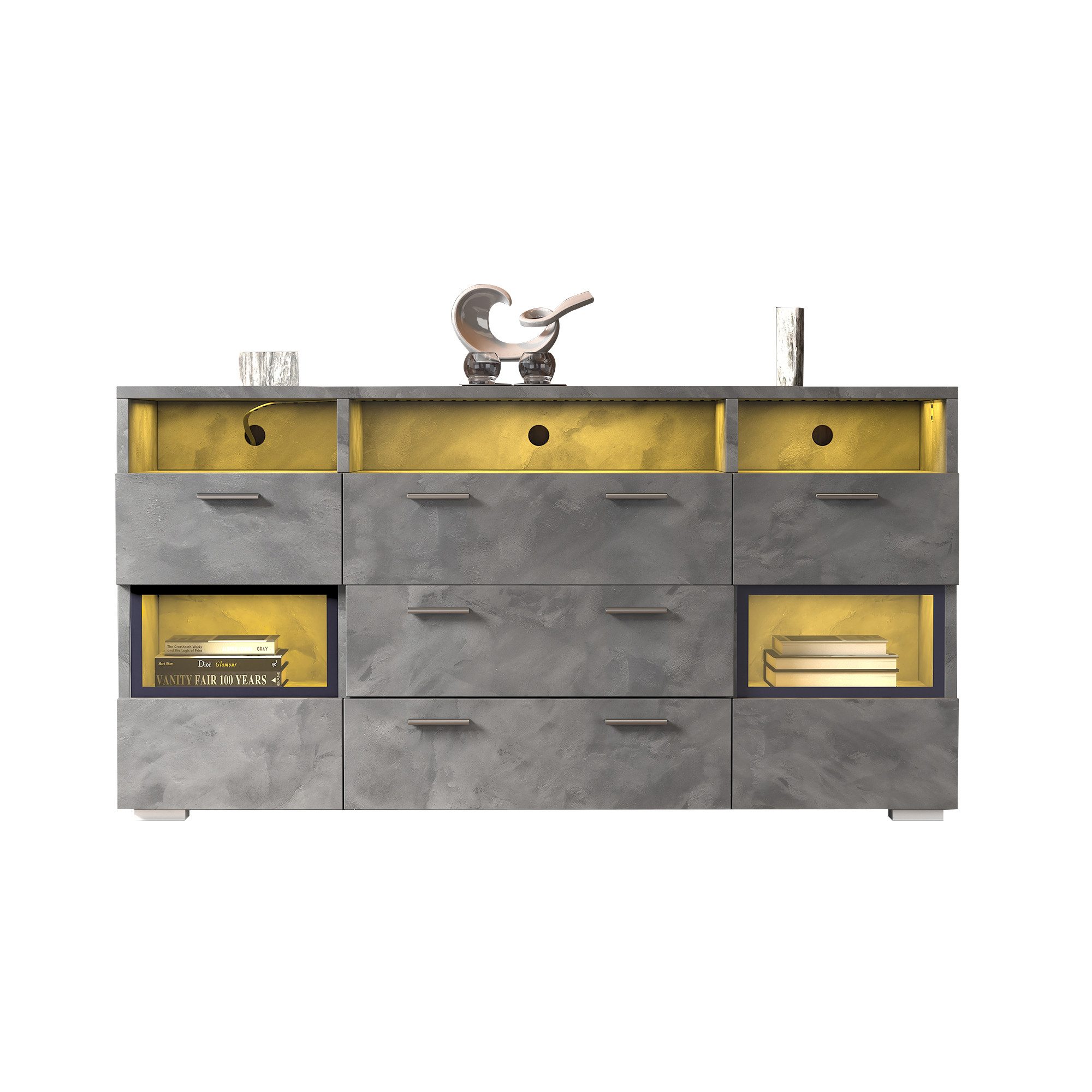 Mit seiner eleganten grauen Farbe und dem hochwertigen Material aus Spanplatte fügt sich das Sideboard nahtlos in jede moderne Einrichtung ein. Es verfügt über drei geräumige Schubladen und zwei Türen, die Ihnen viel Platz für die Aufbewahrung von Kleidung, Büchern, Geschirr und vielem mehr bieten.