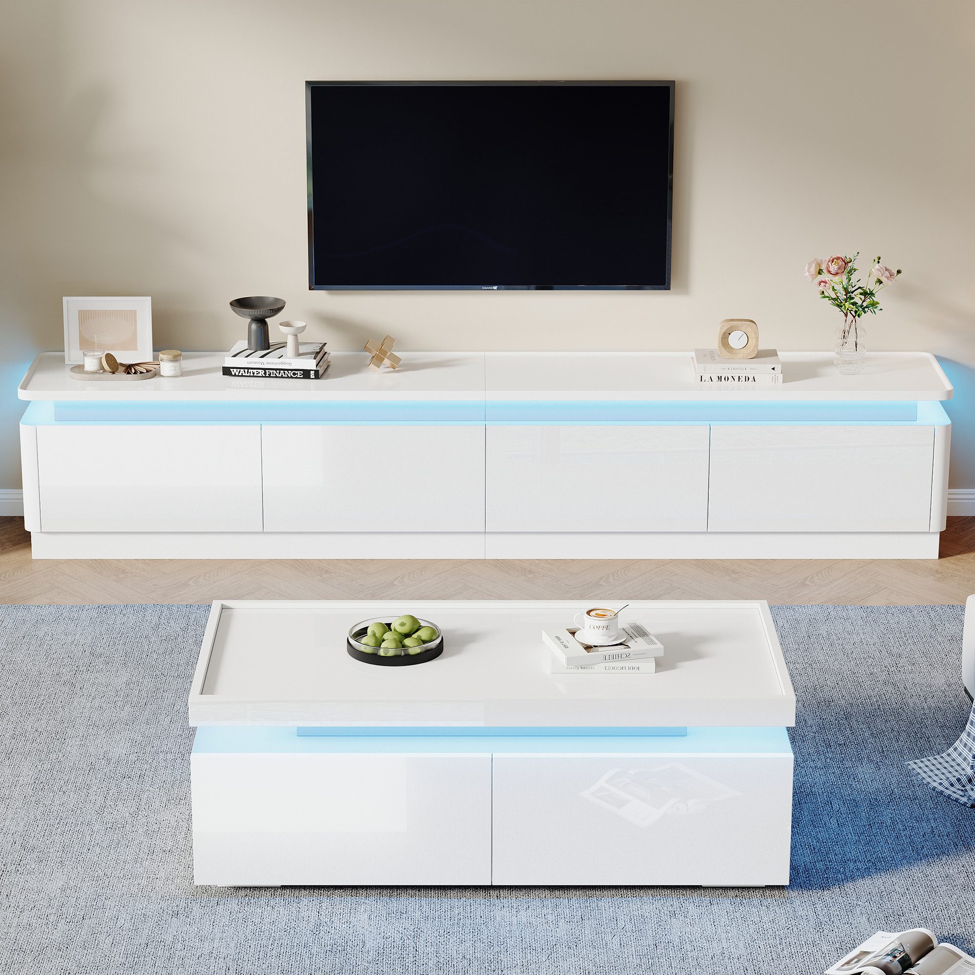 MODFU TV-Schrank- und Couchtisch-Set überzeugt mit bogenförmigen Kanten, die Kinder und ältere Menschen schützen. Das weiße Hochglanz-Finish sorgt für modernen Look und helle, freundliche Atmosphäre.