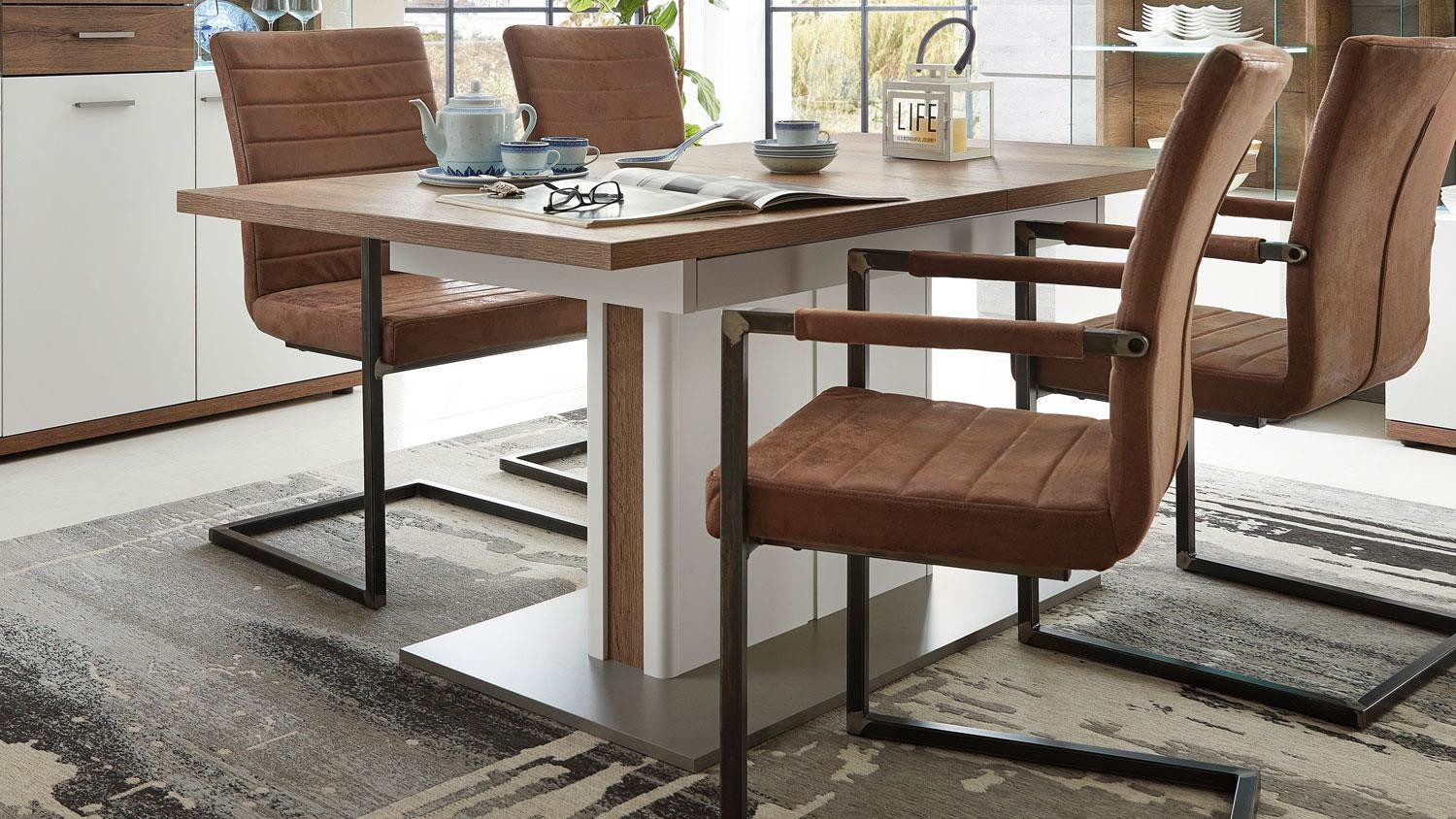 Hochwertiger Esszimmertisch aus dem Programm Light Line 2 in der Farbkombination weiß matt Lack und Struktur Kanada Eiche mit silberfarbener Fußplatte. Dieser Säulentisch ist mit einem praktischen Synchronauszug inklusive einer Einlegeplatte ausgestattet. Dadurch lässt er sich kinderleicht von 160 cm auf 205 cm ausziehen und bietet somit Platz für bis zu acht Personen. Wunderschöner Esstisch von Die Hausmarke in unverwechselbarem Design mit erstklassigem Charme.