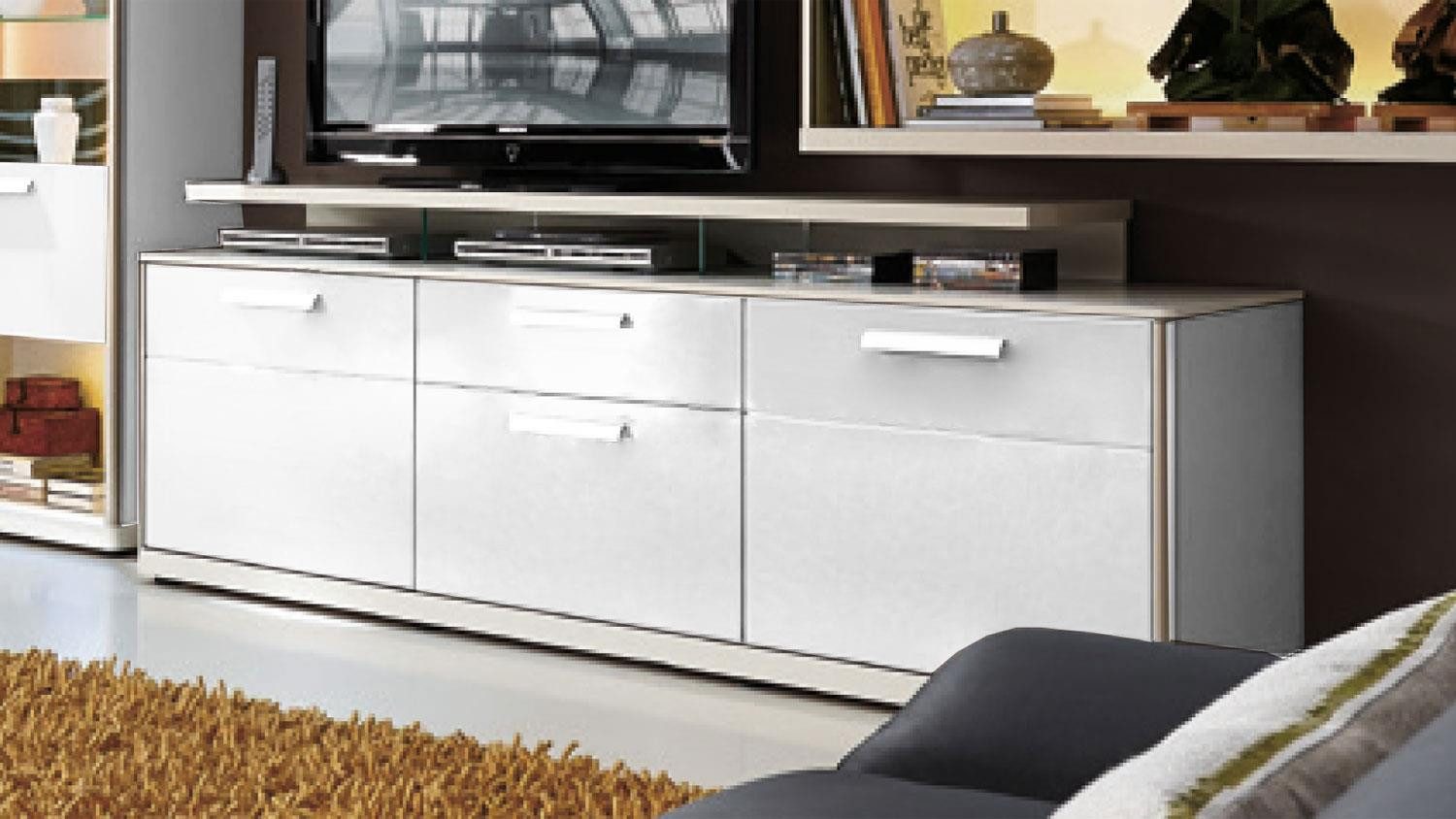 Ausführung | Front und Korpus Weiß matt lackiert, Abgerundete Kanten, TV Aufsatz |