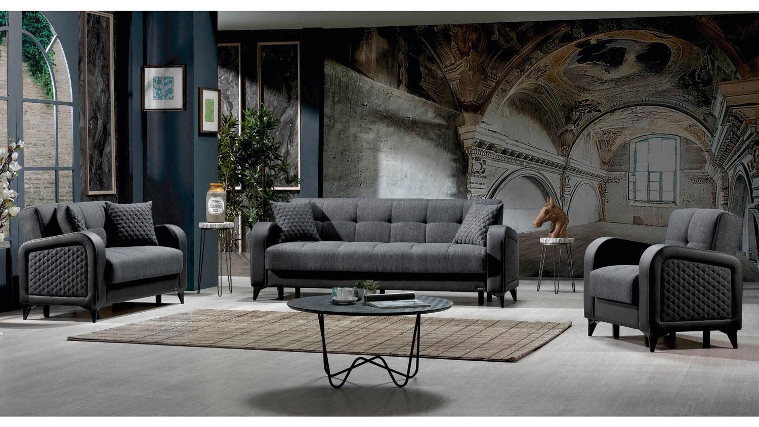 Diese optisch ansprechende 3-teilige Polstergarnitur RIVER von Seher Bomis bringt eine elegante und gemütliche Atmosphäre in Ihr Wohnzimmer. Sie besticht mit einem Bezug in dunkelgrau und einem Korpus, sowie Armlehnen in Kunstleder schwarz. Die rautenförmige Ziersteppung an beiden Armlehnen verleiht diesem Möbelstück eine exquisite Note. Ausgestattet sind alles 3 Möbelstücke mit einer Federkernpolsterung, Bettfunktion und Bettkasten. So bietet diese praktische Polstergarnitur spontanen Gästen eine angenehme Schlafmöglichkeit. Впередe günstige Wohnmöbel finden Sie in unserem Onlineshop.