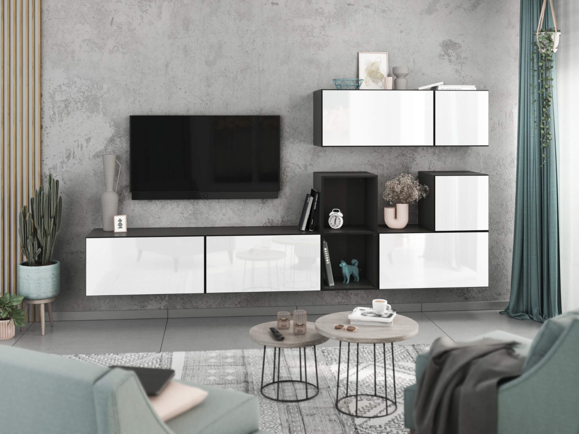 Die Wohnwand Varianto überzeugt durch modernes Design, hochwertige Materialien und eine flexible Gestaltung. Das 7-teilige Set besteht aus zwei kleinen Schränken mit Softclose-Türen, vier praktischen Klappenschränken mit wahlweise nach oben oder unten öffnenden Fronten sowie einem offenen Regal für dekorative Akzente.
