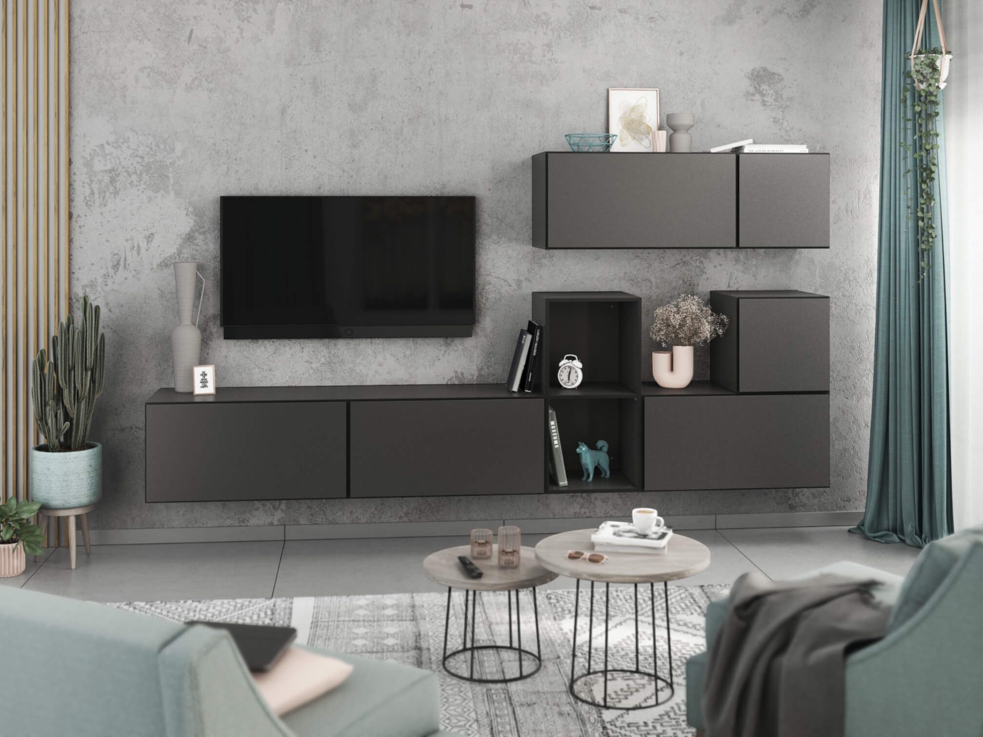 Dank des modularen Aufbaus lassen sich die Schränke sowohl als harmonisches Set als auch einzeln nach Wunsch anordnen. Das flexible Baukastensystem ermöglicht zudem, die Wohnwand jederzeit mit weiteren Elementen zu erweitern und perfekt an Ihre Wohnsituation anzupassen.