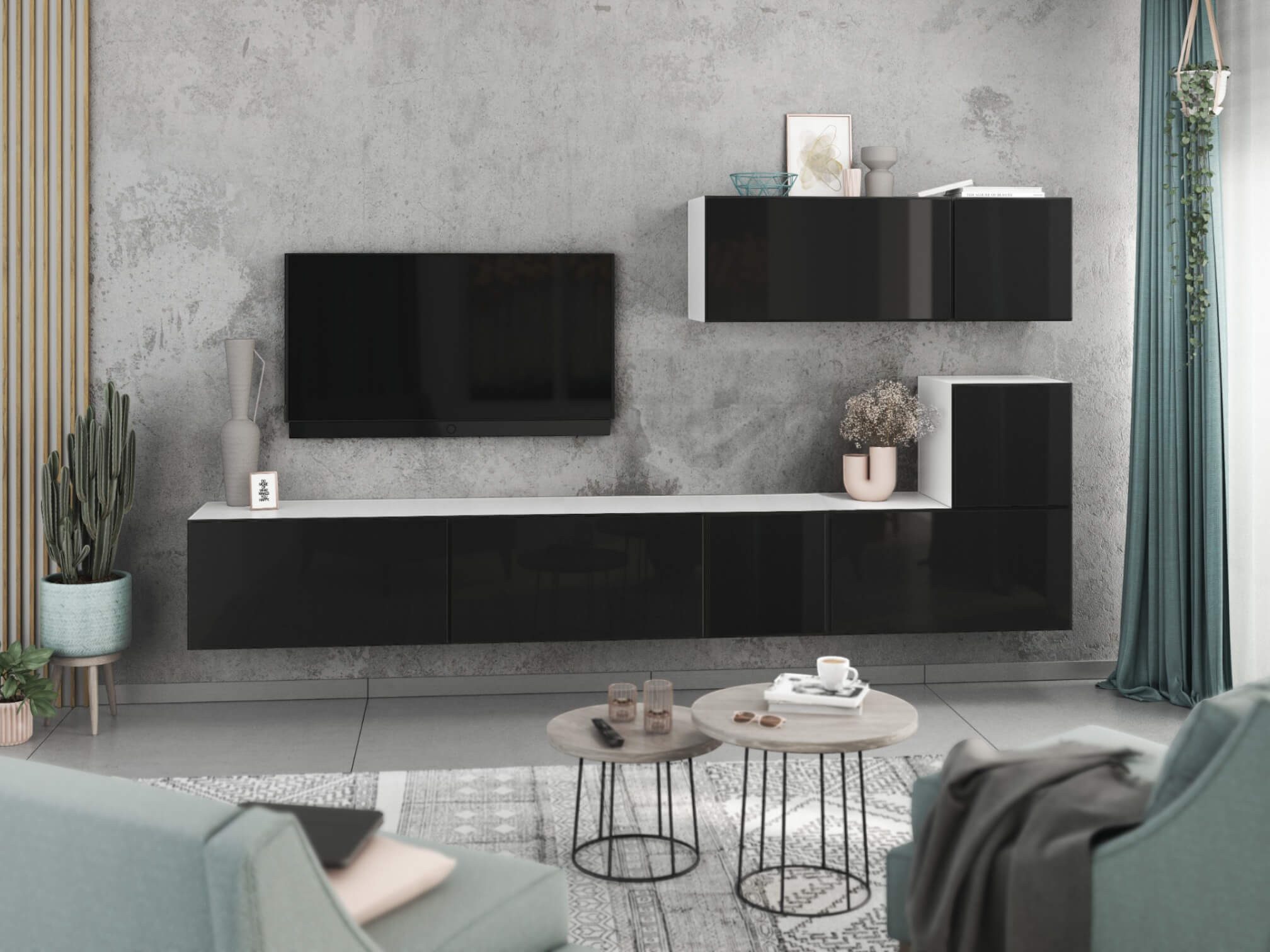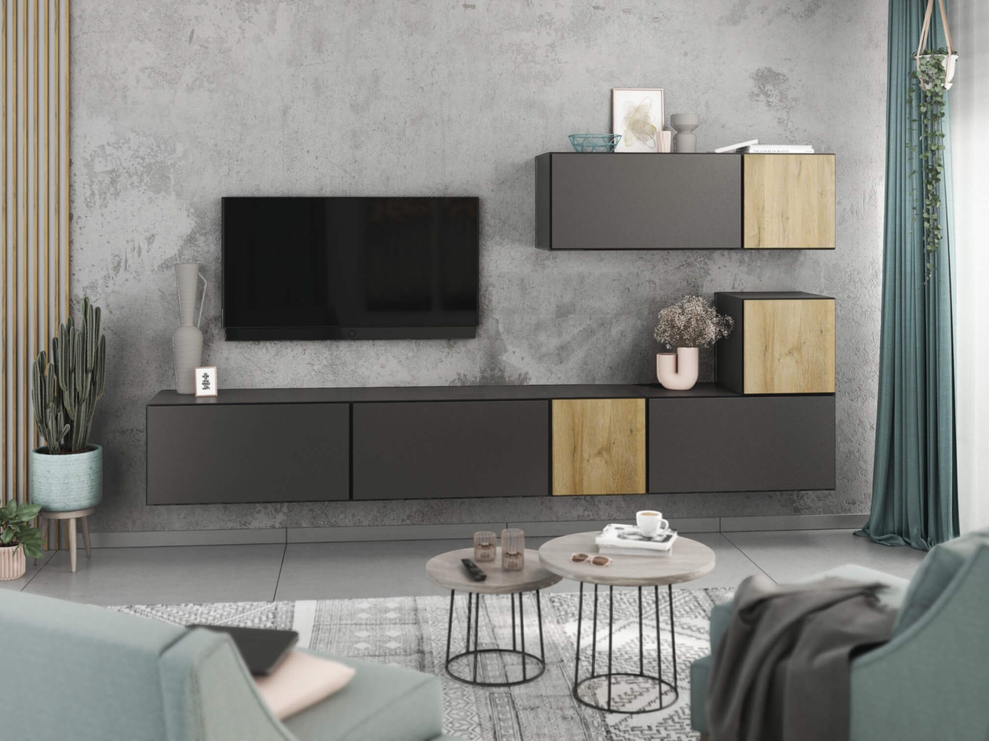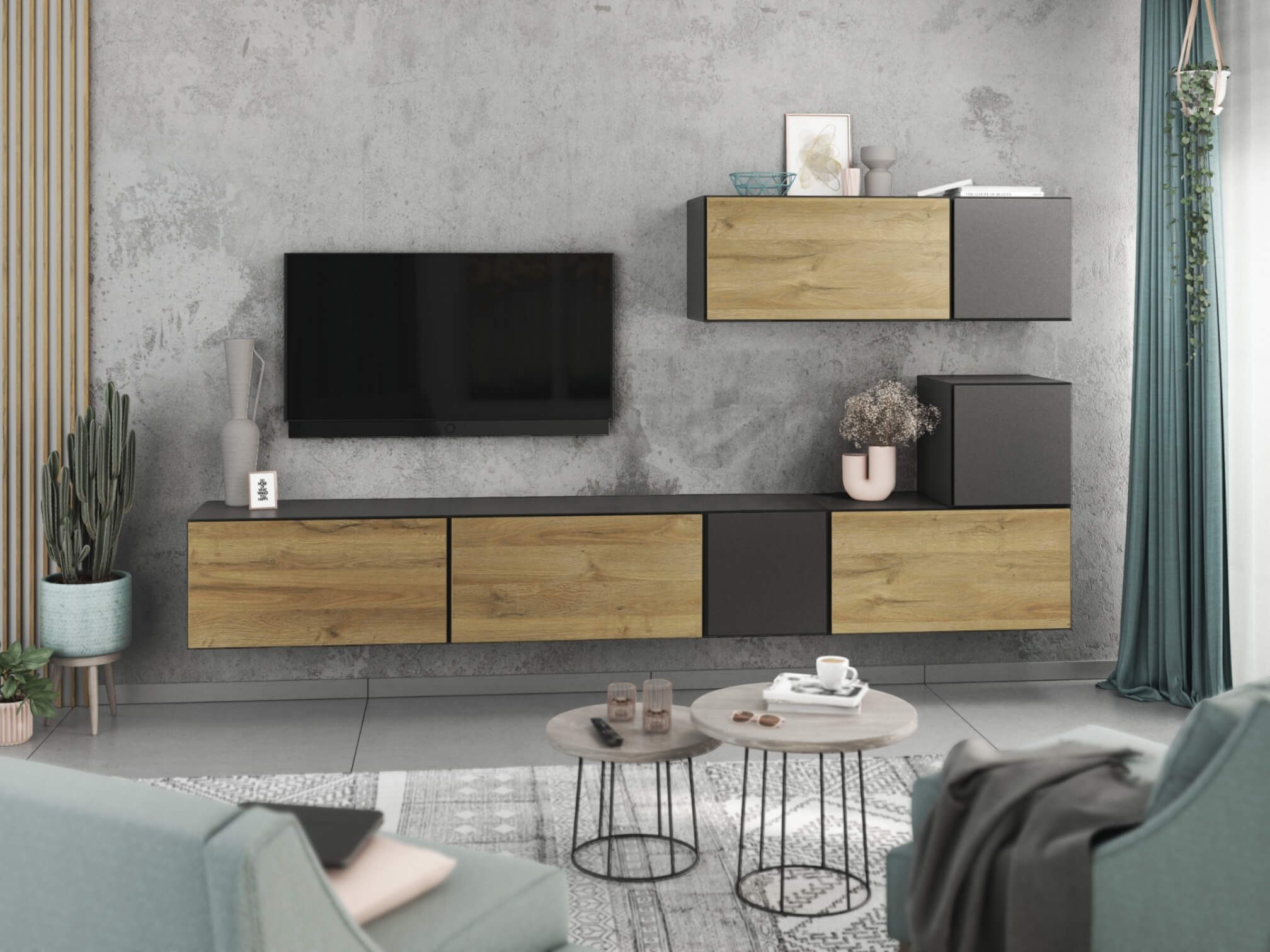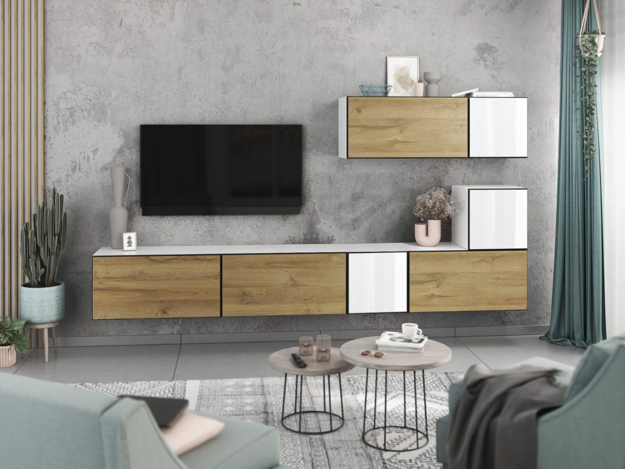 Dank des modularen Aufbaus lassen sich die Schränke sowohl als harmonisches Set als auch einzeln nach Wunsch anordnen. Das flexible Baukastensystem ermöglicht zudem, die Wohnwand jederzeit mit weiteren Elementen zu erweitern und perfekt an Ihre Wohnsituation anzupassen.