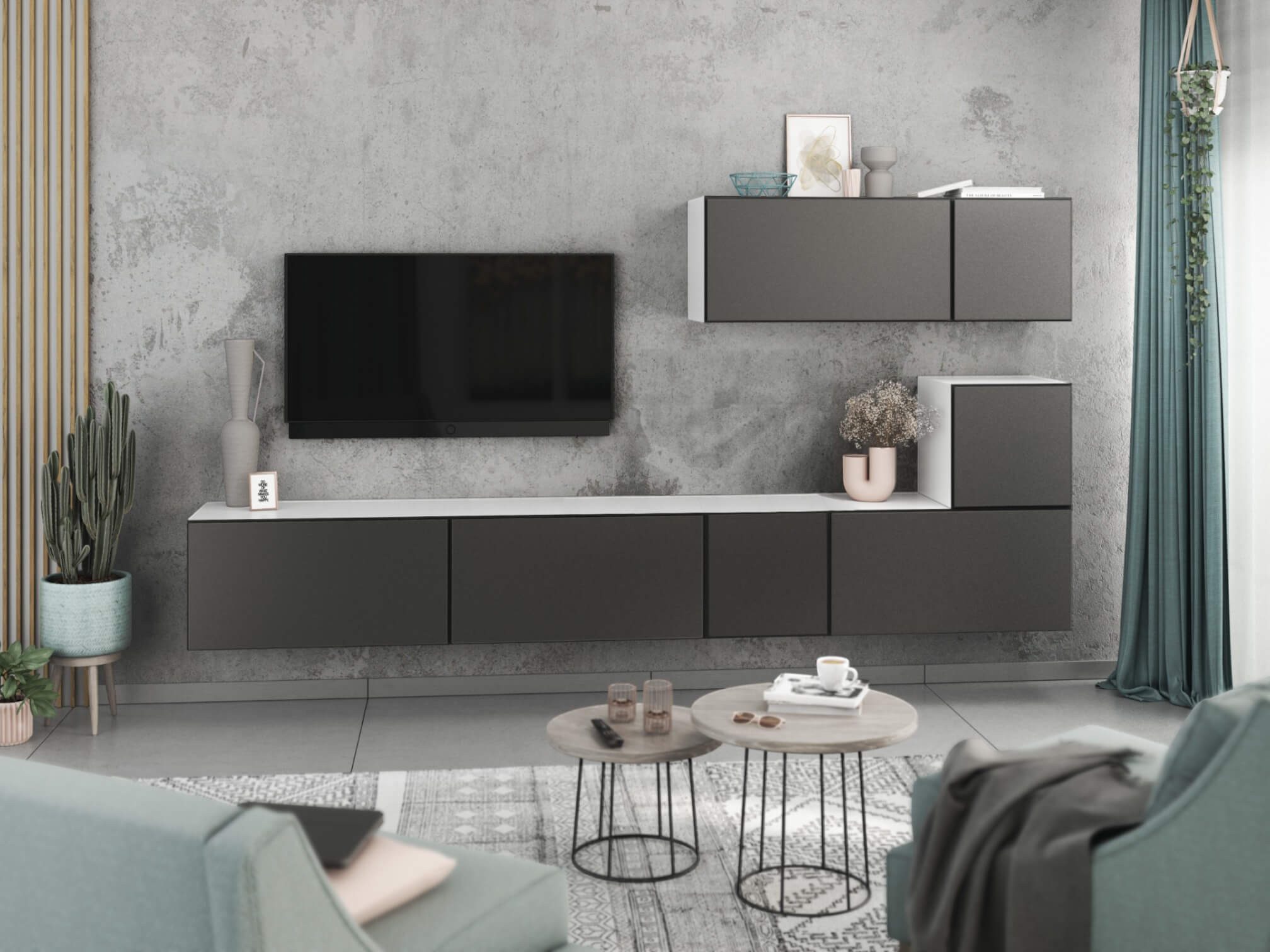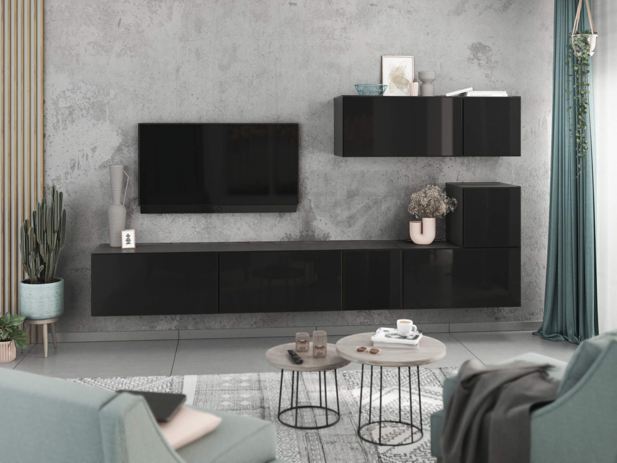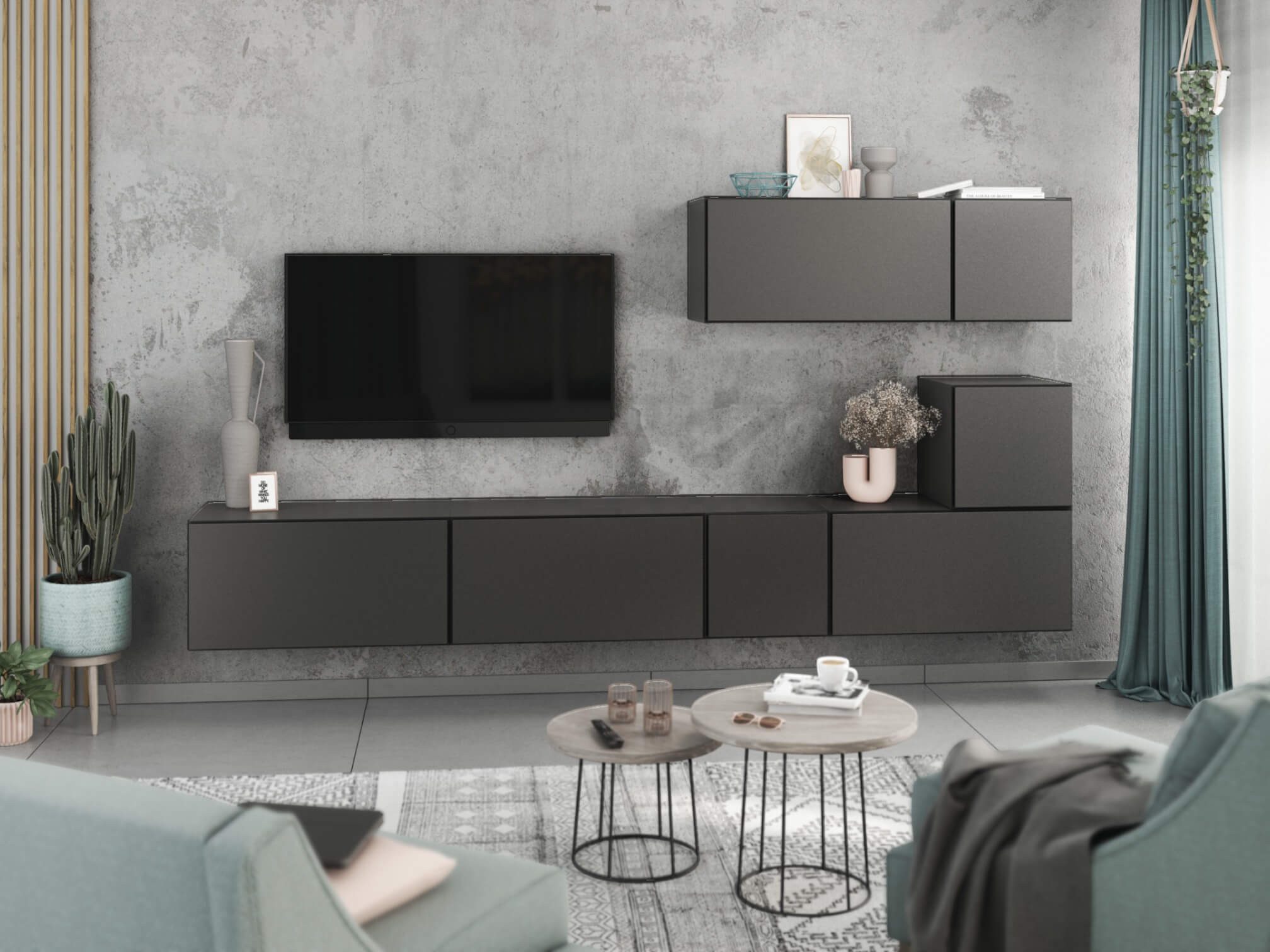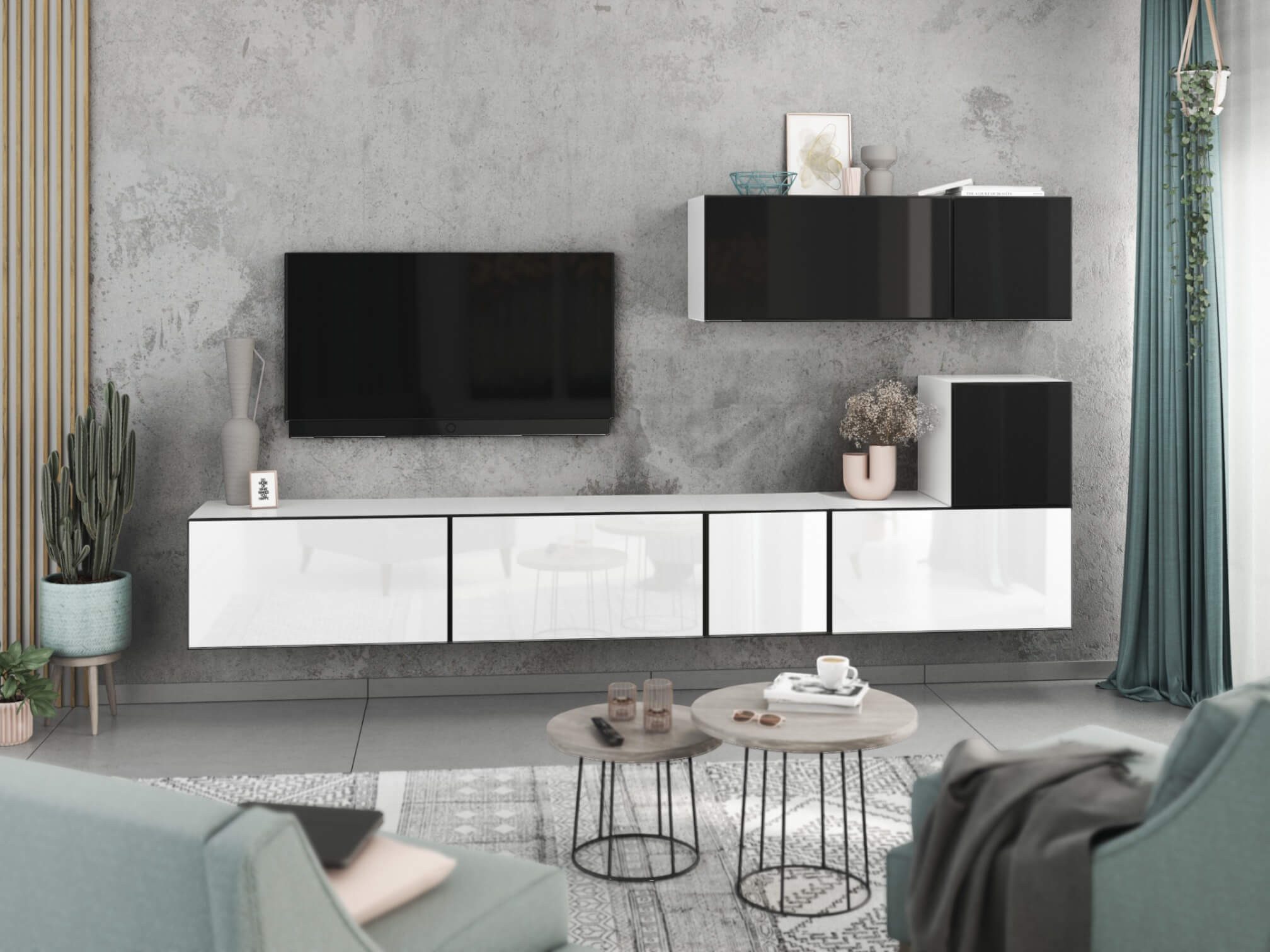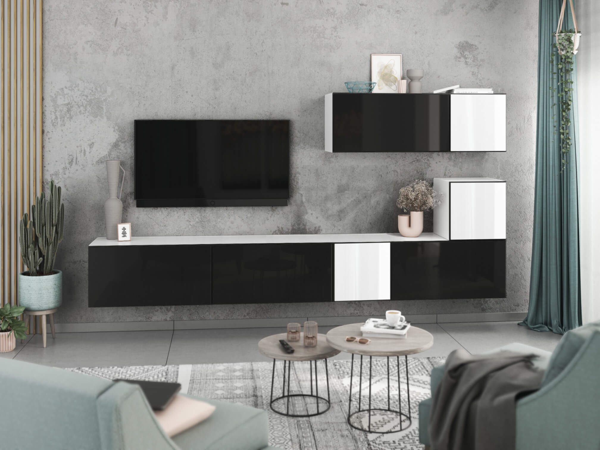 Dank des modularen Aufbaus lassen sich die Schränke sowohl als harmonisches Set als auch einzeln nach Wunsch anordnen. Das flexible Baukastensystem ermöglicht zudem, die Wohnwand jederzeit mit weiteren Elementen zu erweitern und perfekt an Ihre Wohnsituation anzupassen.