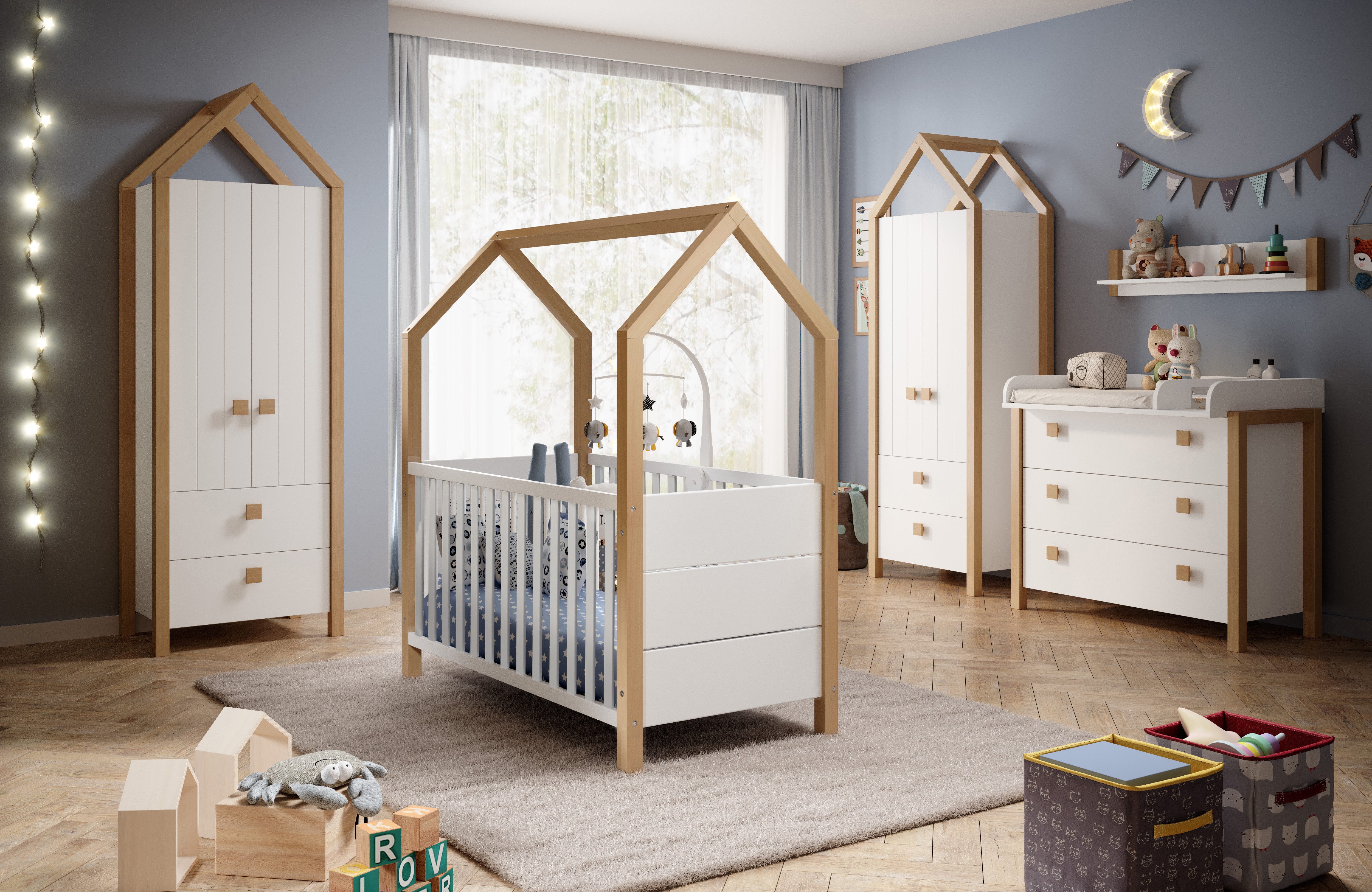 Babyzimmer Beach 6 teilig Set in Kiefer weiß teilmassiv mit Absetzungen Birke massiv. Die klare Formensprache in Haus-Optik sorgt für ein modernes, zeitloses Ambiente – perfekt kombinierbar mit neutralen Textilien und Naturtönen.