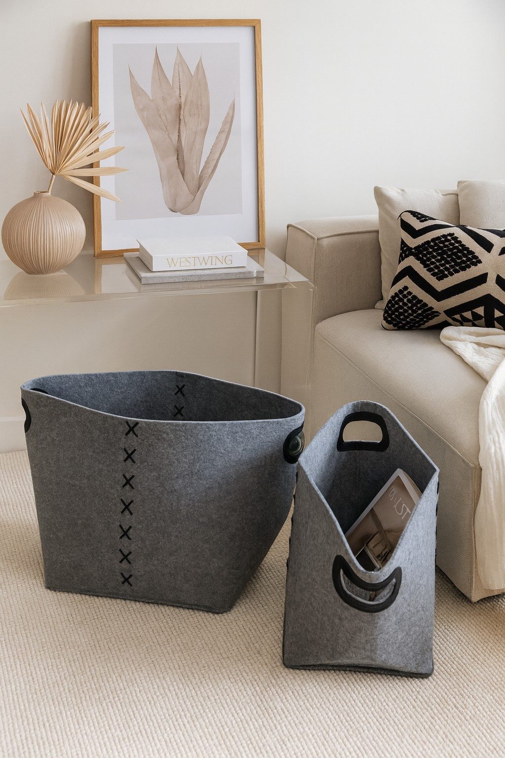 Stilvolle Filzkörbe mit je zwei stabilen Tragegriffen und moderner Kontrastnaht im Kreuzstich. Das zeitlose Grau fügt sich nahtlos in viele Wohnstile ein – ob Wohnzimmer, Flur, Bad oder Kinderzimmer. Jeder Korb ist bis ca. 10 kg belastbar und bietet praktische Ordnung für Decken, Spielzeug, Zeitschriften oder Wäsche.