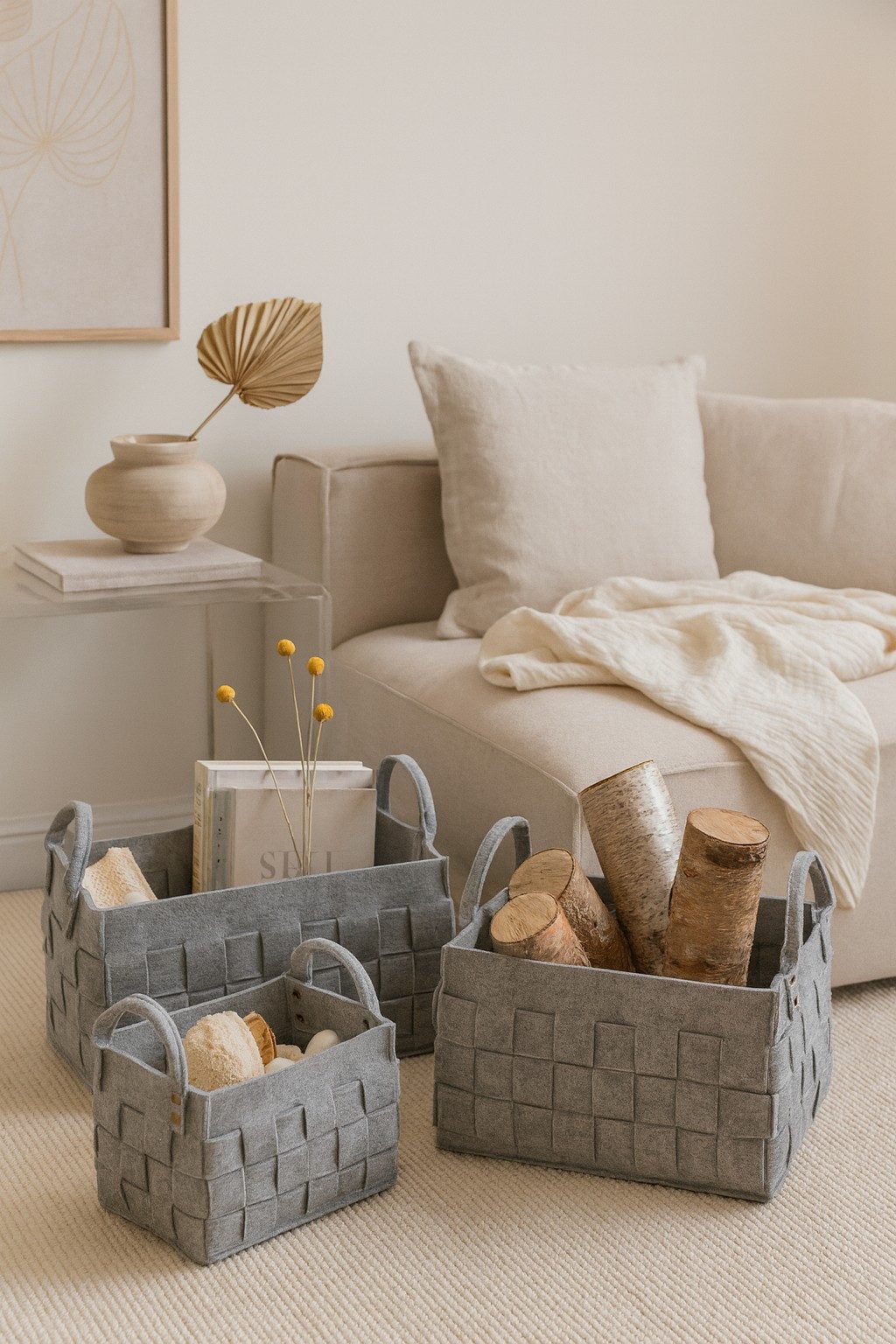 Stilvolle Filzkörbe im praktischen 3er-Set mit je zwei Tragegriffen auf jeder Seite. Die Farbe Grau wirkt modern und passt zu jedem Wohnstil. Ob im Wohnzimmer, Flur, Bad oder Kinderzimmer – dieses Set sorgt überall für Ordnung und Stil. Jeder Korb ist bis ca. 10 kg belastbar und vielseitig einsetzbar.