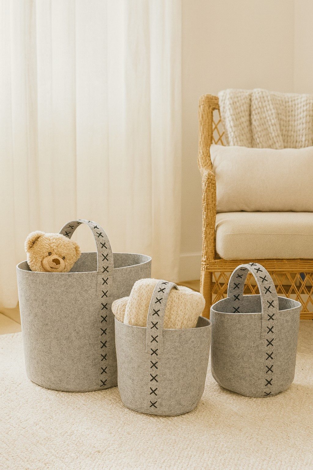 Stilvolles 3-teiliges Filztaschen-Set mit praktischen Tragegriffen. Die mittige Kontrastnaht im „Kreuzstich“ setzt moderne Akzente, während die zeitlose Farbe Grau zu verschiedensten Wohnstilen passt. Jede Tasche/Korb ist bis ca. 10 kg belastbar – ideal für Decken, Spielzeug, Zeitschriften oder Wäsche.