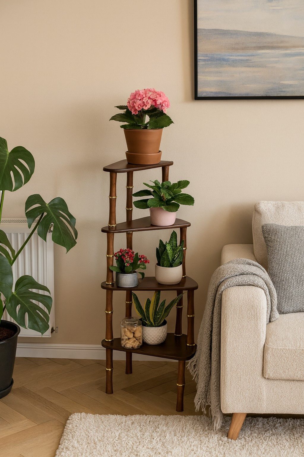 Blumentreppe mit 4 Stufen aus MDF, Beine aus Massivholz Gummibaum, kombiniert mit messingfarbenen Metallscheiben. Die pflegeleichten, glatten Oberflächen sind holzfarben lackiert bzw. gebeizt und lackiert. Stellfläche je Boden ca. 24 cm. Lieferung erfolgt zur Selbstmontage, inklusive Aufbauanleitung. Maße ca. cm: (B/H/T) 40/65/40. Lieferbare Farben: Nussbaum und Kirsch.