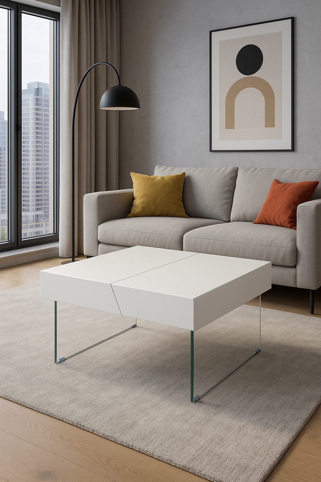 Dieser funktionale Couchtisch überzeugt durch sein modernes Design und durchdachte Details. Das stabile Gestell besteht aus Sicherheits-Klarglasplatten, auf denen eine ausziehbare Tischplatte montiert ist. Die Tischplatte ist aus hochwertigem Holzwerkstoff gefertigt – außen matt weiß und innen dunkel holzbeschichtet für einen edlen Kontrast.
