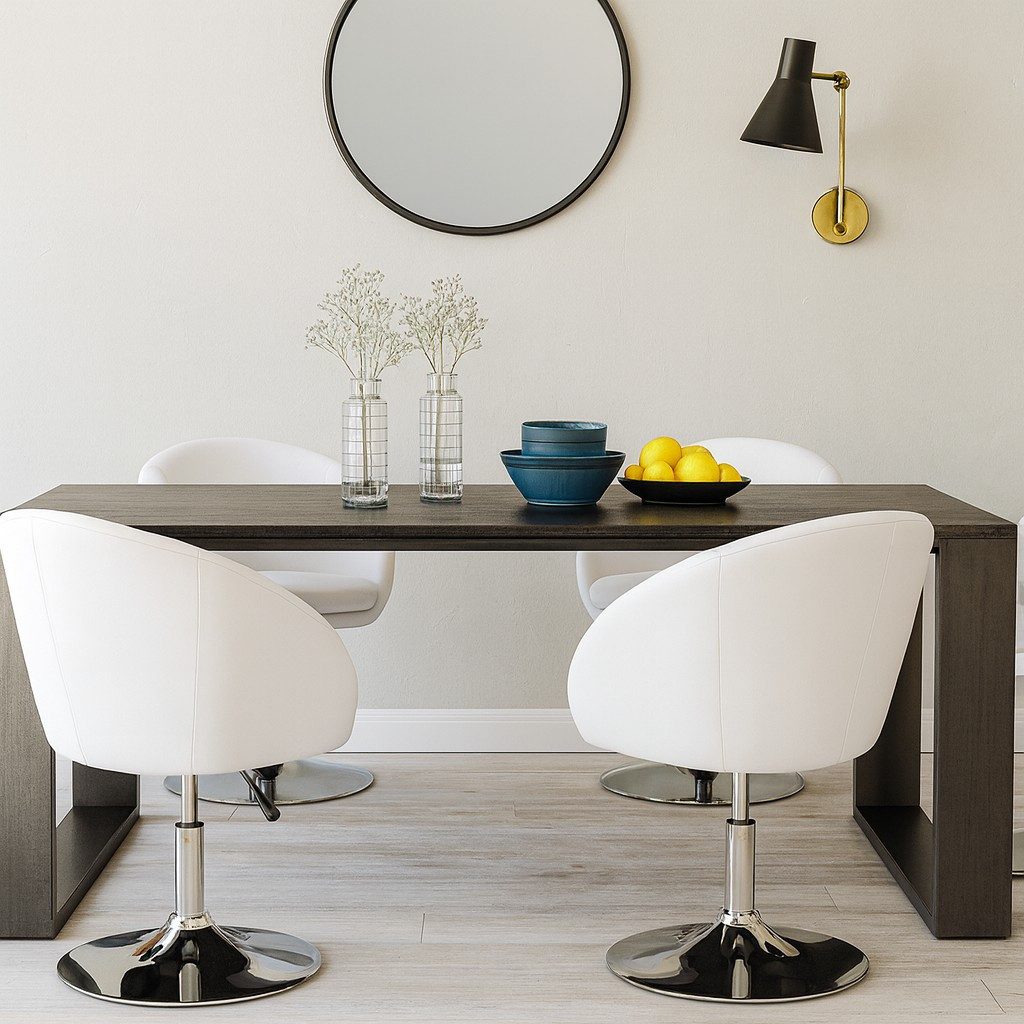 Dieser moderne Drehsessel überzeugt durch seine elegante Optik und hohen Sitzkomfort. Die drehbare Sitzschale ist komplett mit Schaumstoff gepolstert und mit einem pflegeleichten Kunstlederbezug (100% Polyurethan) bezogen. Das Gestell aus Metall in Chromoptik ist dank Gasdruckfeder stufenlos um ca. 12 cm höhenverstellbar.