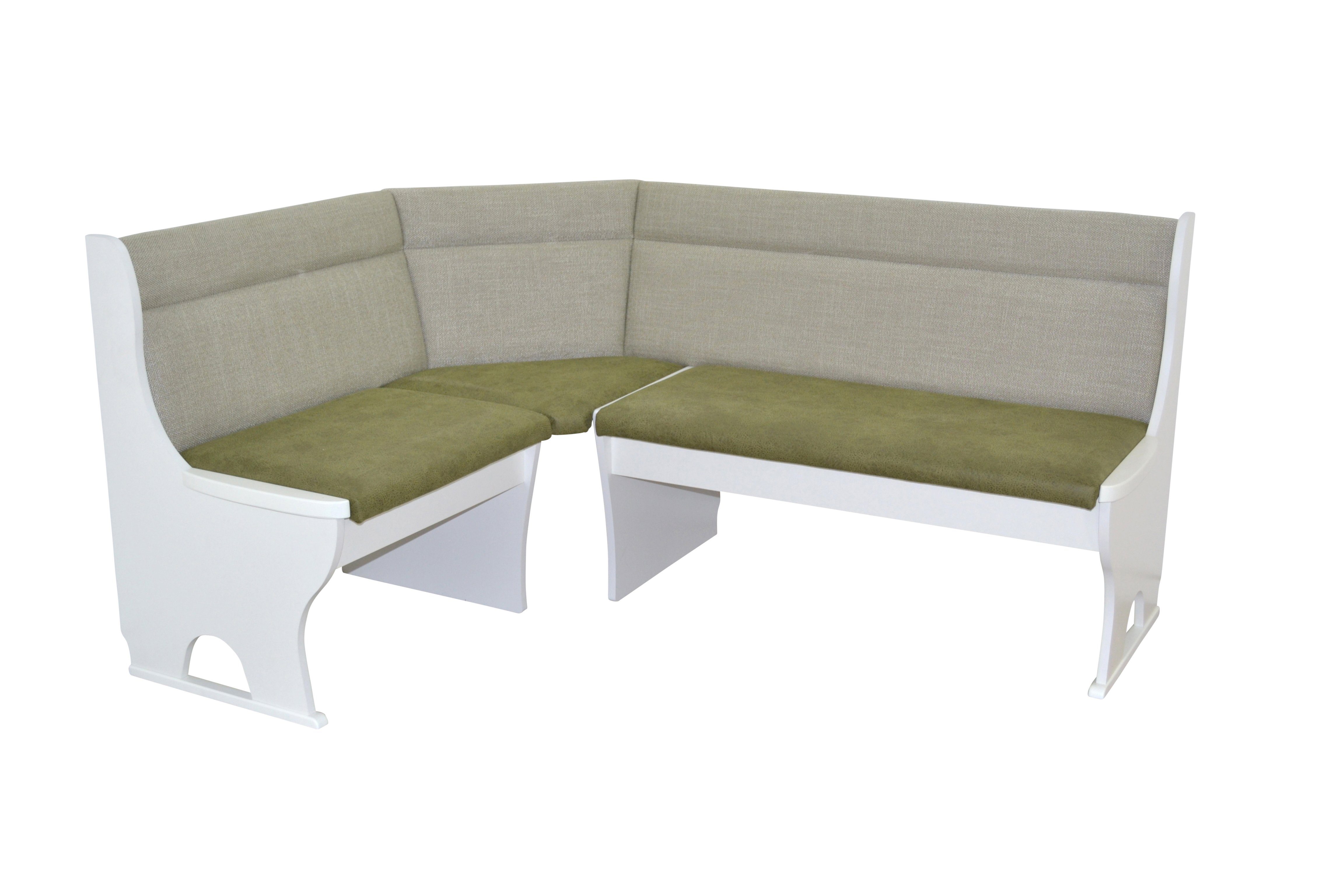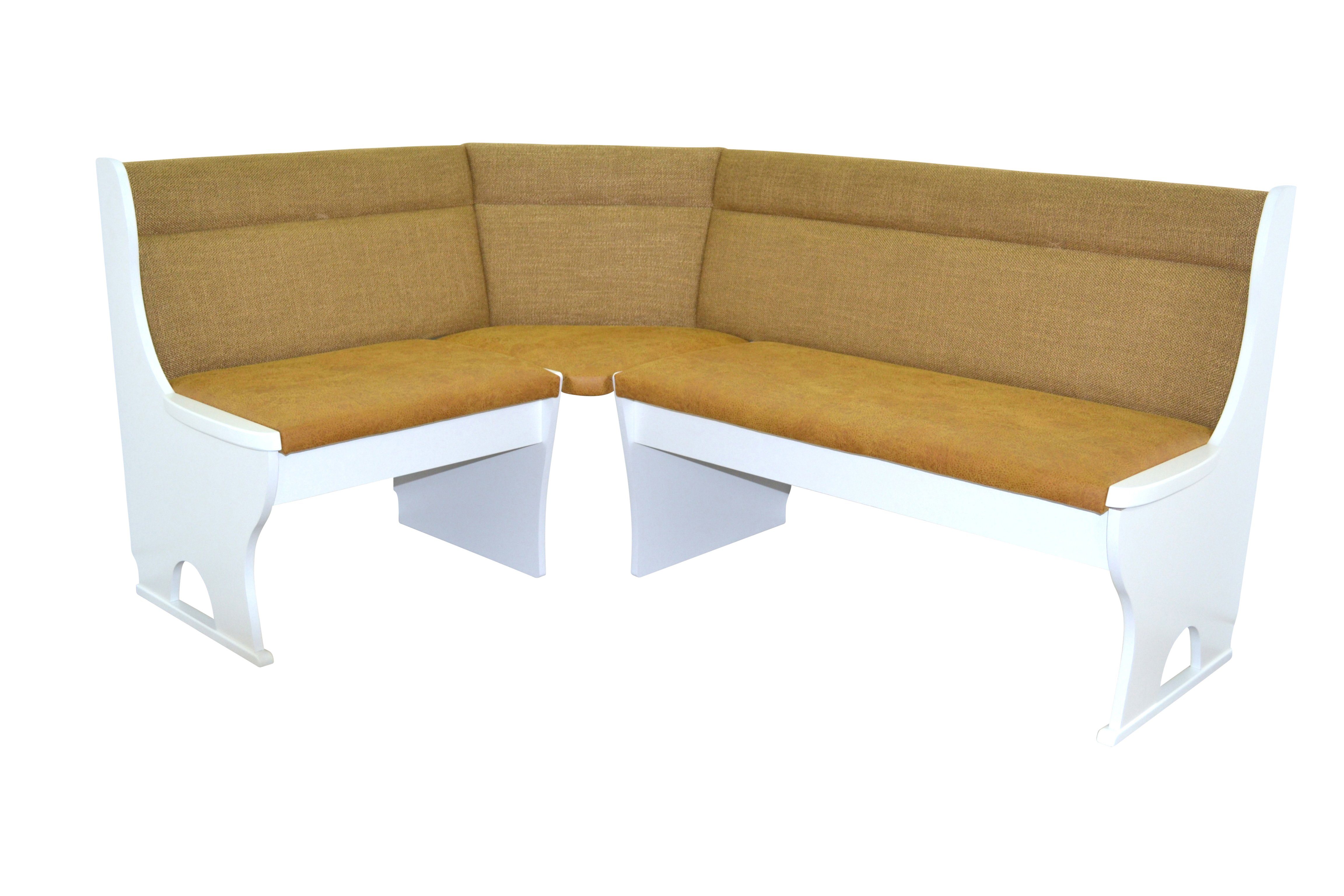 Moderne Truhen-Eckbank mit einem Schenkelmaß von 125 x 165 cm in fünf verschiedenen Stoff-Farb-Kombinationen lieferbar. Schenkel rechts/links montierbar. Gestell der modernen Eckbank ist aus Holzwerkstoff (Melaminspanplatten), das mit einem pflegeleichten Melamin-Holzdekor, uni weiß, beschichtet ist. An den Außenwangen rechts/links ist jeweils eine gesoftete, abgerundete Massivholzleiste montiert. Sitzflächen aufklappbar, darunter praktischer Stauraum. Dank der Gasdruckfeder lässt sich die Sitzfläche sicher und sanft schließen. Sitz- und Rückenflächen sind bequem schaumstoffgepolstert. Sitzfläche ist mit einem Stoffbezug in Lederoptik (100% Polyester), unifarben, bezogen und Rückenfläche mit einem Strukturstoffbezug (90% Polyester/10% Rayon), unifarben bezogen. Lieferung der Eckbank erfolgt zur Selbstmontage, inklusive Aufbauanleitung. Maße ca. cm: Schenkelmaß 125x165 cm, Tiefe 57 cm, Höhe ca. 85 cm. Sitzhöhe ca. 46 cm. Passender Esstisch und Stühle auch lieferbar.