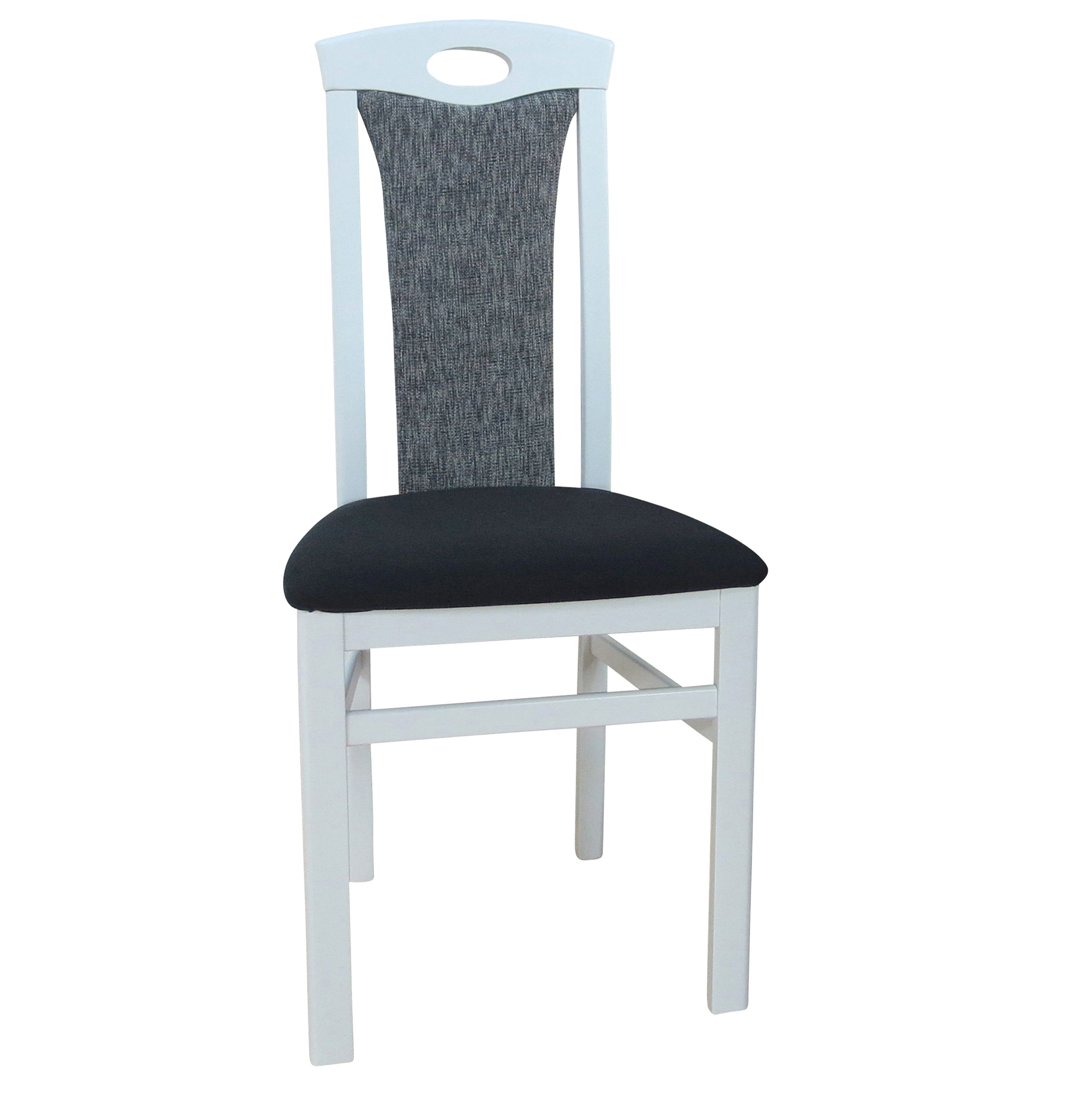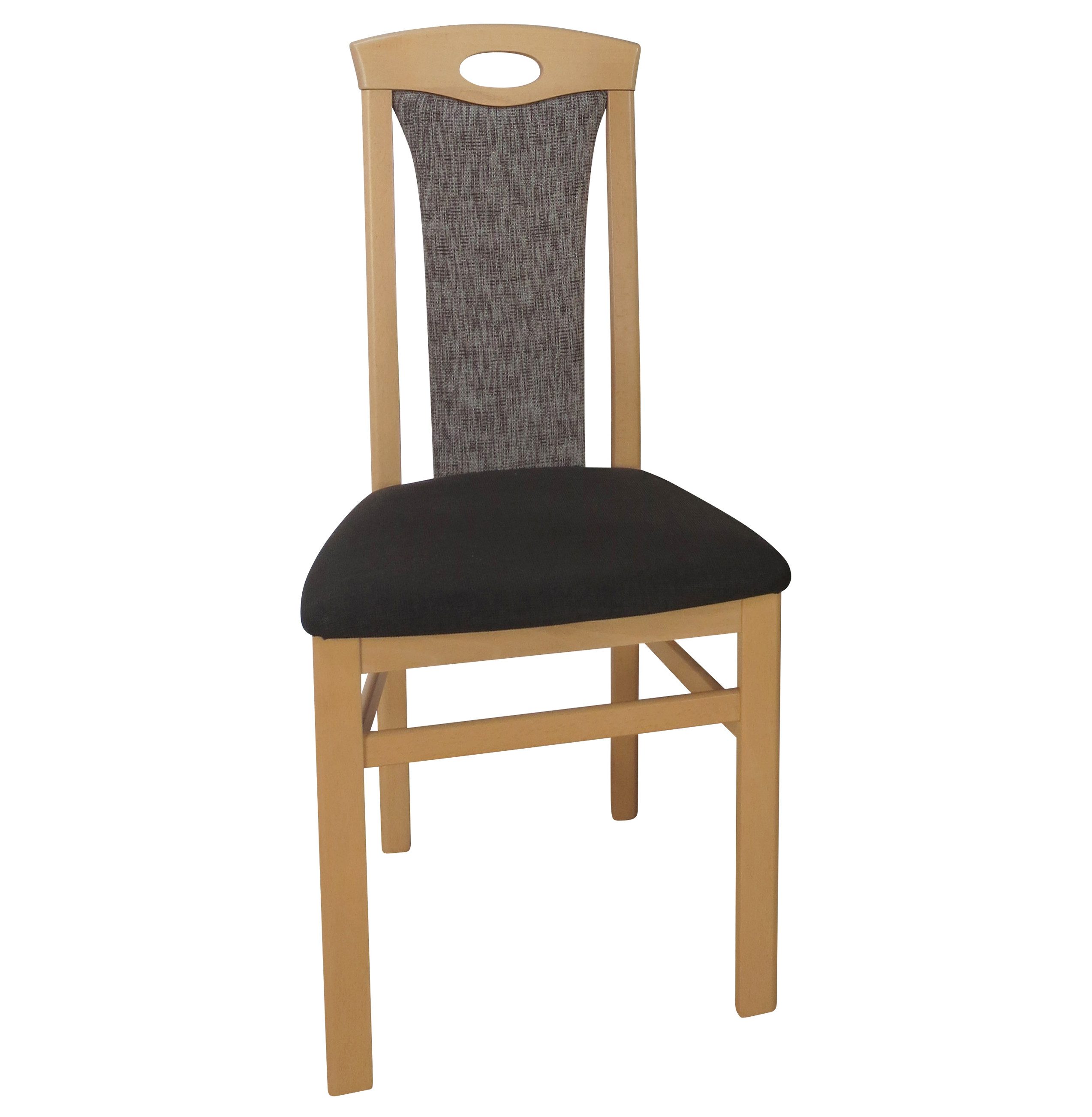 Hochertiger Esszimmerstuhl aus Massivholz Buche, lackiert. Sitz und Rückenmittelteil sind bequem schaumstoffgepolstert und mit attraktiven Stoffbezügen bezogen. Sitz unifarben und Rücken mit einem Strukturstoff meliert, Stoffzusammensetzung jeweils 100% Polyester, wahlweise schwarz oder braun. Massivholzgestell wahlweise weiß lakciert mit Stoffbezügen in schwarz oder Buche-Nachbildung gebeizt und lackiert, mit Bezügen in braun. Im Rückenoberteil ist eine praktische Griffmuschel eingearbeitet. Lieferung vom 4-Fuß-Stuhl erfolgt montiert. Maße ca. cm: Breite 45, Tiefe 48 cm, Höhe 95 cm. Sitzhöhe ca. 46 cm, Sitztiefe ca. 39 cm. Diese schönen Stühle lassen sich bequem und schnell mit einer Vielzahl von Esstischen kombinieren.