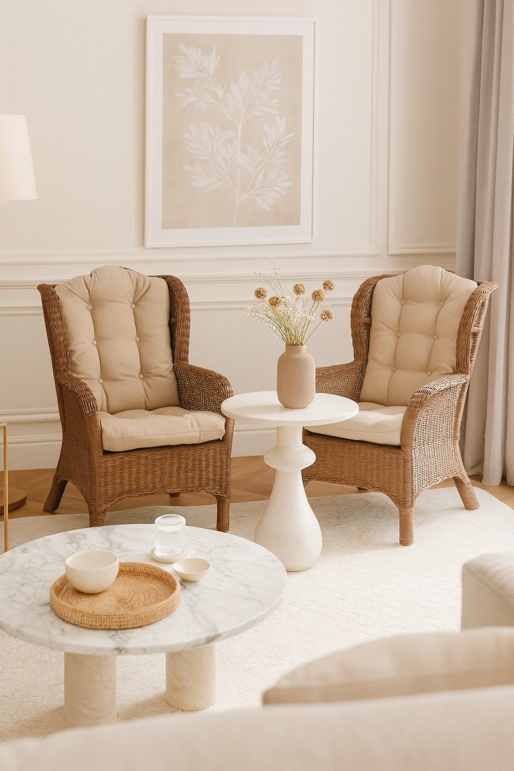 Stilvoller Rattansessel aus 100% Naturmaterial Rattanrohr, von Hand geflochten und hochwertig verarbeitet. Inklusive passender Sitz- und Rückenkissen mit cremefarbenem Stoffbezug (100% Polyester). Die extra starke Vliesfüllung sowie die formstabile Absteppung sorgen für besten Sitzkomfort und Langlebigkeit.