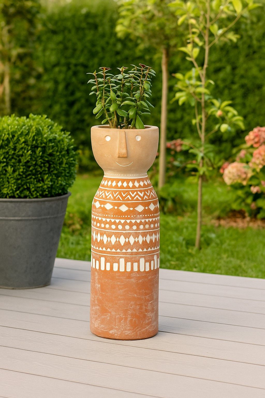 Setzen Sie einen humorvollen Akzent in Ihrem Zuhause oder Außenbereich mit diesem einzigartigen Pflanzständer mit Gesicht. Die liebevoll gestaltete Figur aus robustem Polyresin (Kunststein) besticht durch feine Details, eine terrafarbene Oberfläche und dekorative weiße Verzierungen im Ethno-Stil.